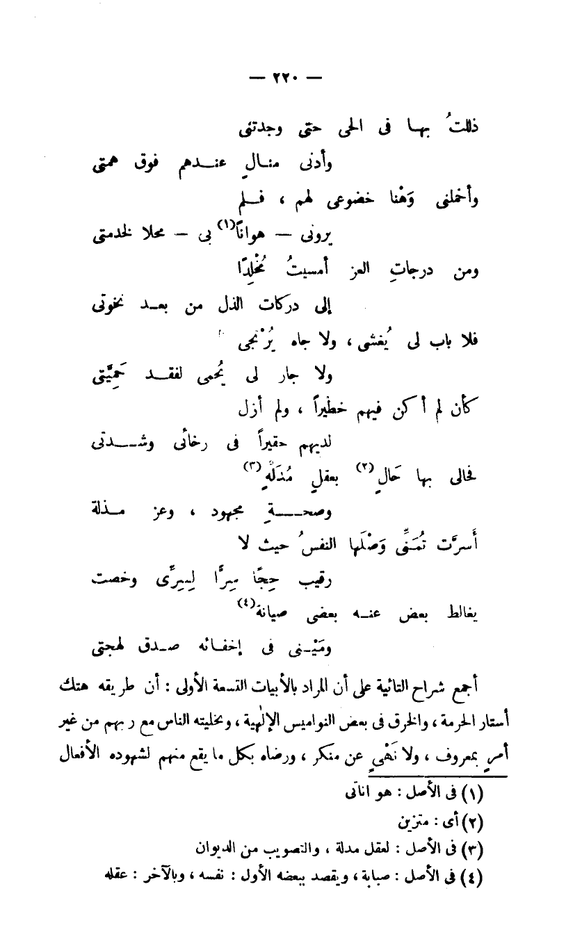 أجمع شراح التائية على أن المراد بالأبيات التسعة الأولى، أن طريقه هتك أستار الحرمة، والخرق في بعض النواميس الإلهية، وتخليته الناس مع ربهم من غير أمر بمعروف، ولا نهي عن منكر، ورضاه بكل ما يقع منهم لشهوده الأفعال