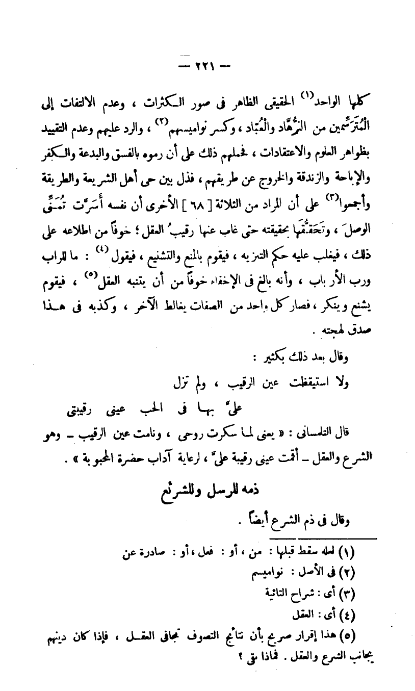 كلها الواحد1 الحقيقي الظاهر في صور الكثرات، وعدم الالتفات إلى المترسمين من الزهاد والعباد، وكسر نواميسهم2، والرد عليهم وعدم التقييد بظواهر العلوم والاعتقادات، فحملهم ذلك على أن رموه بالفسق والبدعة والكفر والإباحة والزندقة والخروج عن طريقهم، فذل بين حي أهل الشريعة والطريقة وأجمعوا3 على أن المراد من الثلاثة [68] الأخرى أن نفسه أسرت تمني الوصل، وتحققها بحقيقته حتى غاب عنها رقيب العقل؛ خوفا من إطلاعه على ذلك، فيغلب عليه حكم التنزيه، فيقوم بالمنع والتشنيع، فيقول4: ما للراب ورب الأرباب، وأنه بالغ في الإخفاء خوفا من أن يتنبه العقل5، فيقوم يشنع وينكر، فصار كل واحد من الصفات يغالط الآخر، وكذبه في هذا صدق لهجته.