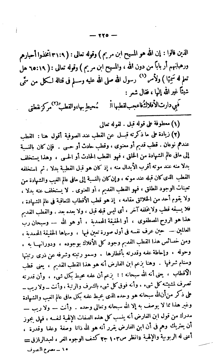 2 زيادة على ما ذكرته قبل عن القطب عند الصوفية أقول هنا: القطب عندهم نوعان. قطب قديم أو معنوي، وقطب حادث أو حسي. فإن كان بالنسبة إلى ما في عالم الشهادة من الخلق، فهو القطب الحادث أو الحسى، وهذا يستخلف بدلا منه عند موته أقرب الأبدال منه، إذ كان هو قبل القطبية بدلا، ثم استخلفه القطب الذي كان قبله عند موته، وإن كان بالنسبة إلى ما في عالم الغيب والشهادة من تعينات الوجود المطلق، فهو القطب القديم، أو المعنوي، لا يستخلف عنه بدلا، ولا يقوم أحد من الخلائق مقامه، إذ هو قطب الأقطاب المتعاقبة في عالم الشهادة، فلا يسبقه قطب ولا يخلفه آخر، أي: ليس قبله قبل، ولا بعده بعد والقطب القديم هذا هو الروح المصطفوي، أو الحقيقة المحمدية، أو هو الله -وسبحان رب العالمين- حين عرف نفسه في أول صورة تعين فيها، وسماها الحقيقة المحمدية، ومن خصائص هذا القطب القديم وجود كل الأفلاك بوجوده، ودورانها به، وحوله، وإحاطة علمه وقدرته بأقطارها، وسمو رتبته وشرفه عن ذرى رتبتها وسنام شرفها. وهنا يزعم لبن الفارض أنه هو هذا القطب القديم، يعني قطب الأقطاب، يعنى أنه الله سبحانه!! يزعم أن علمه محيط بكل شيء، وأن قدرته تصرف لمشيئته كل شيء، وأنه فوق كل شيء بالشرف والرتبة، وأنت -ولا ريب- على ذكر من أن الله سبحانه هو وحده الذي يحيط علمه بكل ما في عالم الغيب والشهادة وغير هذا مما لا يوصف به إلا الله سبحانه وتعالى وحده. وأنت -ولا ريب- مدرك من قول ابن الفارض أنه ينسب كل هذه الصفات الإلهية لنفسه، فهل يجوز أن يعتريك وهم في أن ابن الفارض يقرر أنه هو الله ذاتا وصفة وعلما وقدرة، أعني له الربوبية والإلهية "انظر ص103جـ2 كشف الوجوه الغر، لعبد الرازق القاشاني المطبوع على هامش شرح ديوان ابن الفارض ط 1310هـ المطبعة الخيرية" فعنه بخاصة كتبت ما كتبت عن القطب، وإن كان لنا شيء فالأسلوب وحده. كل هذا لنقطع على الصوفية سبيل ادعاء أن ما نقول مفترى عليهم، فلا والله ما نأخذ ما نكتبه عنهم إلا من كتب آلهتهم!!