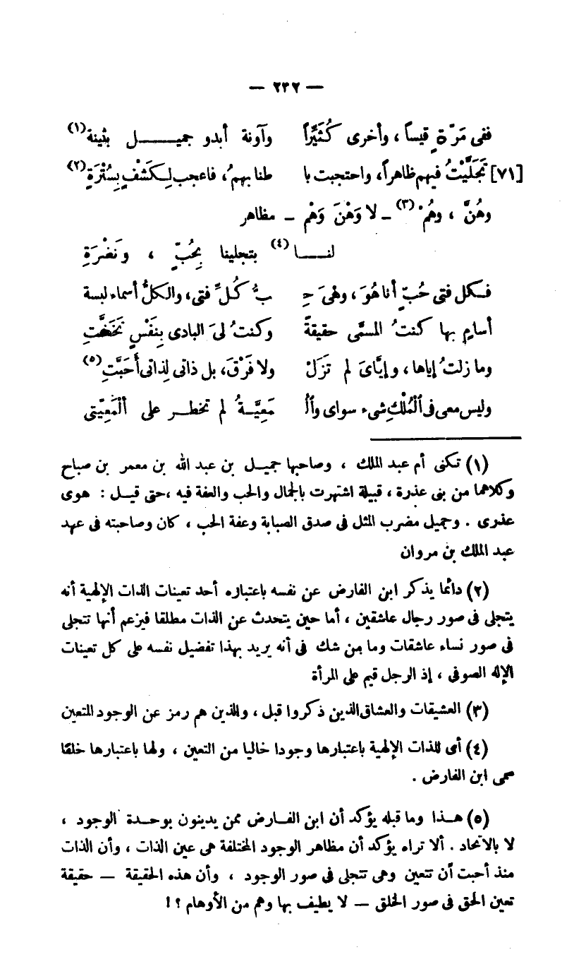 2 دائما يذكر ابن الفارض عن نفسه باعتباره أحد تعينات الذات الإلهية أنه يتجلى في صور رجال عاشقين، أما حين يتحدث عن الذات مطلقا فيزعم أنها تتجلى في صور نساء عاشقات وما من شك في أنه يريد بهذا تفضيل نفسه على كل تعينات الإله الصوفي، إذ الرجل قيم على المرأة.