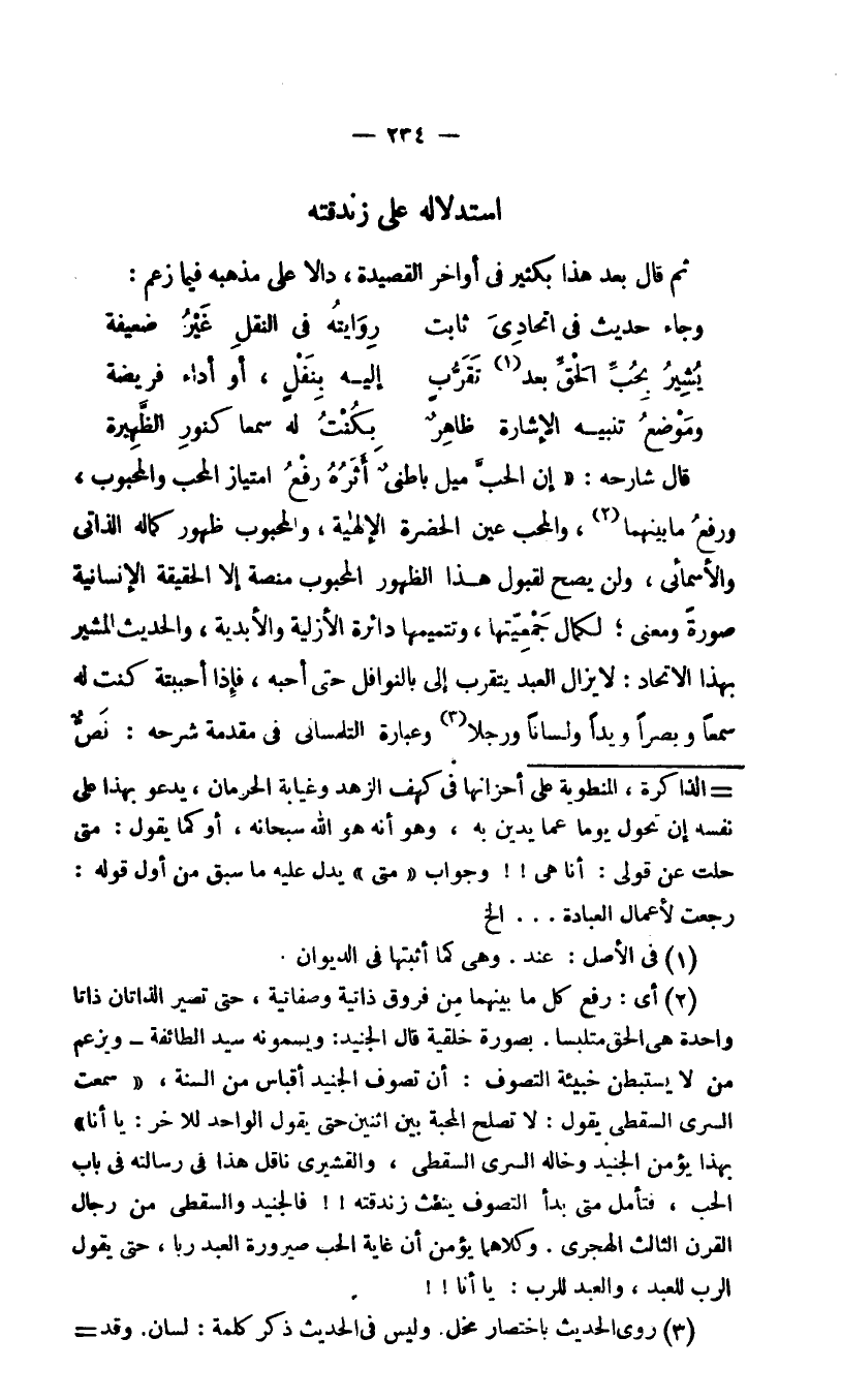 2 أي: رفع كل ما بينهما من فروق ذاتية وصفاتية، حتى تصير الذاتان ذاتا واحدة هي الحق متلبسا. بصورة خلقية قال الجنيد: ويسمونه سيد الطائفة, ويزعم من لا يستبطن خبيئة التصوف: أن تصوف الجنيد أقباس من السنة, "سمعت السري السقطي يقول: لا تصلح المحبة بين اثنين حتى يقول الواحد للآخر: يا أنا" بهذا يؤمن الجنيد وخاله السري السقطي، والقشيري ناقل هذا في رسالته في باب الحب، فتأمل متى بدأ التصوف ينفث زندقته! فالجنيد والسقطي من رجال القرن الثالث الهجري. وكلاهما يؤمن أن غاية الحب صيرورة العبد ربا، حتى يقول الرب للعبد، والعبد للرب: يا أنا!