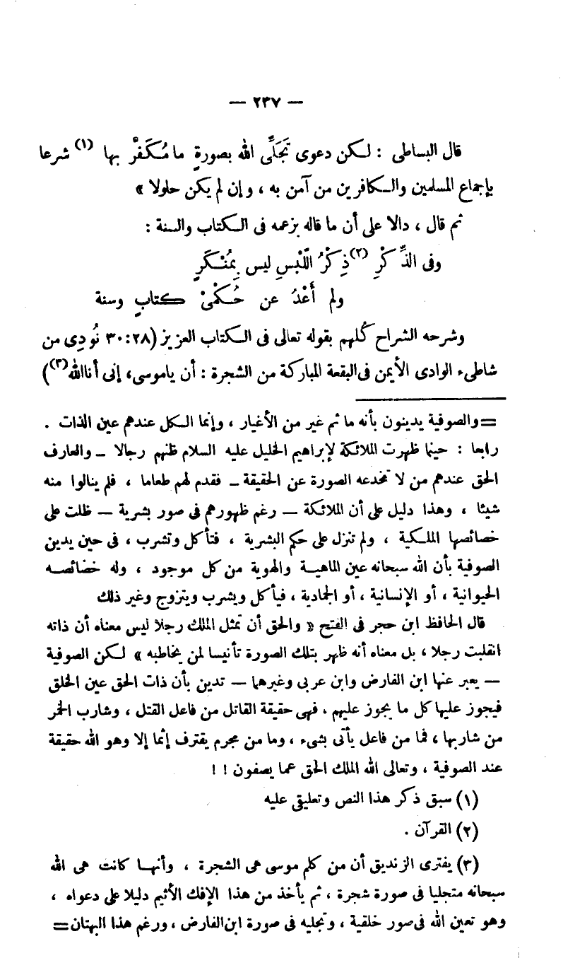 قال البساطي: "لكن دعوى تجلي الله بصورة ما مكفر بها1 شرعا بإجماع المسلمين والكافرين من آمن به، وإن لم يكن حلولا".