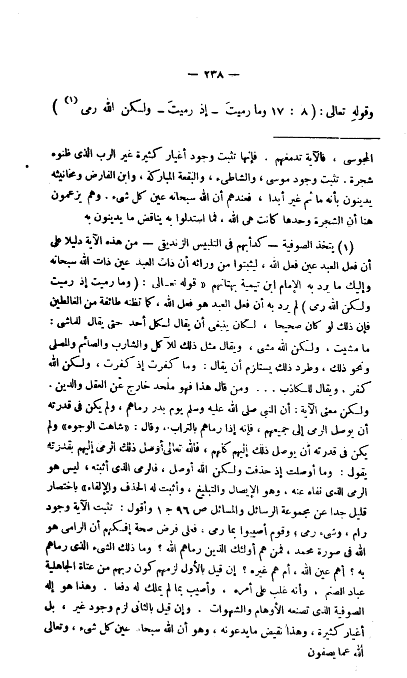 ولكن معنى الآية: أن النبي -صلي الله عليه وسلم- يوم بدر رماهم، ولم يكن في قدرته أن يوصل الرمي إلى جميعهم، فإنه إذا رماهم بالتراب، وقال "شاهت الوجوه" ولم يكن في قدرته أن يوصل ذلك إليهم كلهم، فالله تعالى أوصل ذلك الرمي إليهم بقدرته يقول: وما أوصلت إذ حذفت ولكن الله أوصل, فالرمي الذي أثبته ليس هو الرمي الذي نفاه عنه، وهو الإيصال والتبليغ، وأثبت له الحذف والإلقاء" باختصار قليل جدا عن مجموعة الرسائل والمسائل ص96 جـ1 وأقول: تثبت الآية وجود رام، وشيء رمي، وقوم أصيبوا بما رمي، فعلى فرض صحة إفكهم أن الرامي هو الله في صورة محمد، فمن هم أولئك الذين رماهم الله؟ وما ذلك الشيء الذي رماهم به، أهم عين الله، أم هم غيره؟ إن قيل بالأول لزمهم كون ربهم من عتاة الجاهلية عباد الصنم، وأنه غلب على أمره. وأصيب بما لم يملك له دفعا. وهذا هو إله الصوفية الذي تصنعه الأوهام والشهوات. وإن قيل بالثاني لزم وجود غير، بل أغيار كثيرة، وهذا نقيض ما يدعونه، وهو أن الله سبحانه عين كل شيء، وتعالى الله عما يصفون.