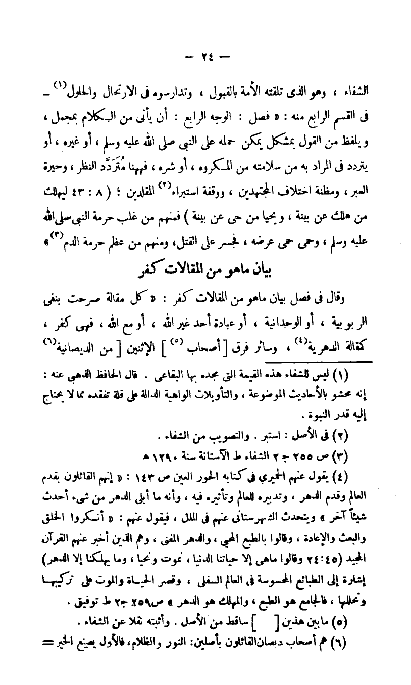 الشفاء، وهو الذي تلقته الأمة بالقبول، وتدارسوه في الارتحال والحلول1 في القسم الرابع منه: "فصل: الوجه الرابع: أن يأتي من الكلام بمجمل، ويلفظ من القول بمشكل يمكن حمله على النبي صَلَّى اللَّهُ عَلَيْهِ وَسَلَّمَ، أو غيره, أو يتردد في المراد به من سلامته من المكروه, أو شره، فههنا متردد النظر, وحيرة العبر، ومظنة اختلاف المجتهدين، ووقفة استبراء2 المقلدين؛ {لِيَهْلِكَ مَنْ هَلَكَ عَنْ بَيِّنَةٍ وَيَحْيَى مَنْ حَيَّ عَنْ بَيِّنَةٍ} [الأنفال: 43] فمنهم من غلب حرمة النبي صَلَّى اللَّهُ عَلَيْهِ وَسَلَّمَ، وحمى حمى عرضه، فجسر على القتل، ومنهم من عظم حرمة الدم3".
