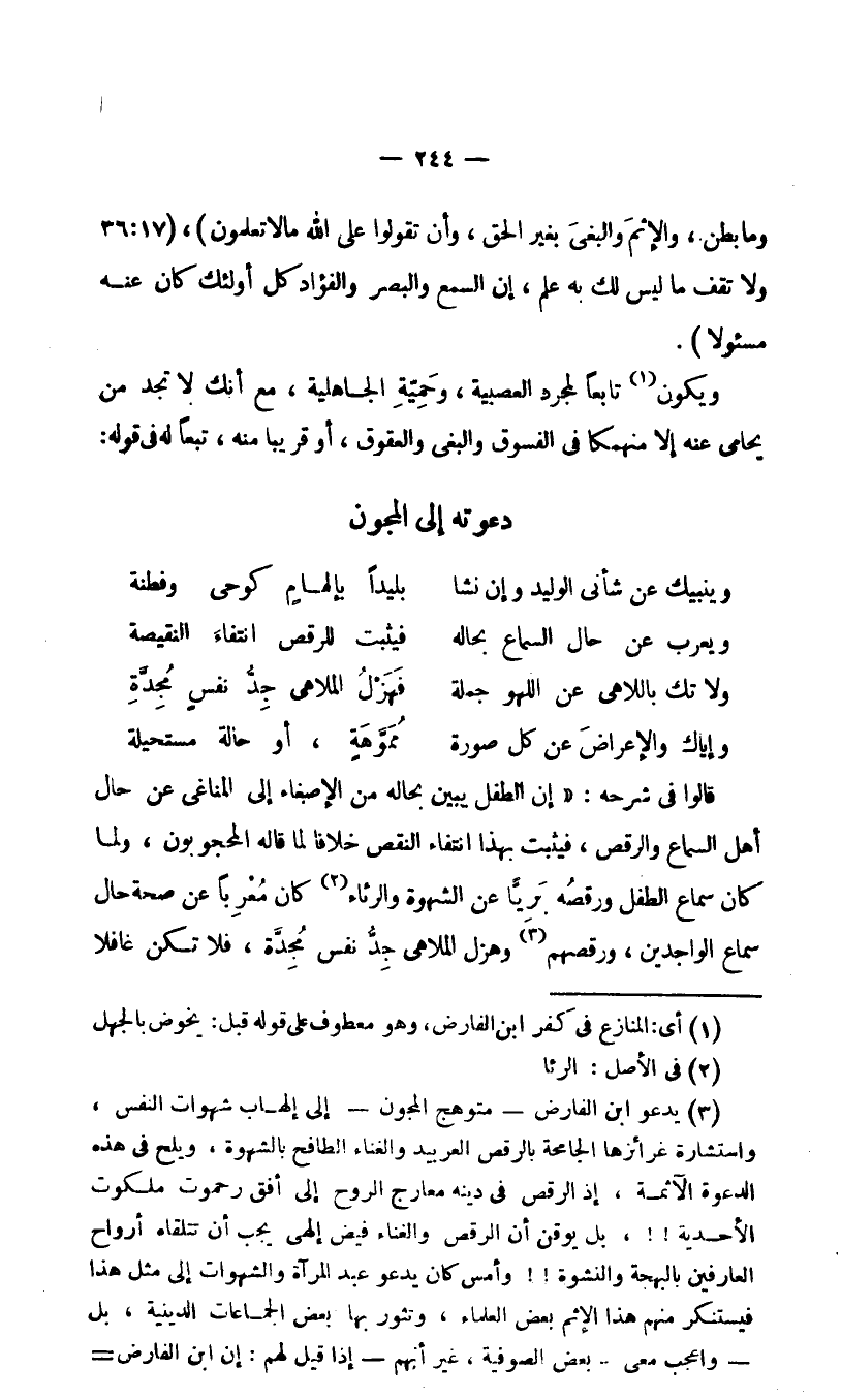 3 يدعو ابن الفارض -متوهج المجون- إلى إلهاب شهوات النفس، واستشارة غرائزها الجامحة بالرقص العربيد والغناء الطافح بالشهوة، ويلح في هذه الدعوة الآثمة، إذ الرقص في دينه معارج الروح إلى أفق رحموت ملكوت الأحدية!! بل يوقن أن الرقص والغناء فيض إلهي يجب أن تتلقاه أرواح العارفين بالبهجة والنشوة!! وأمس كان يدعو عبد المرأة والشهوات إلى مثل هذا فيستنكر منهم هذا الإثم بعض العلماء، وتثور بها بعض الجماعات الدينية، بل -واعجب معي بعض الصوفية، غير أنهم- إذا قيل لهم: إن ابن الفارض =