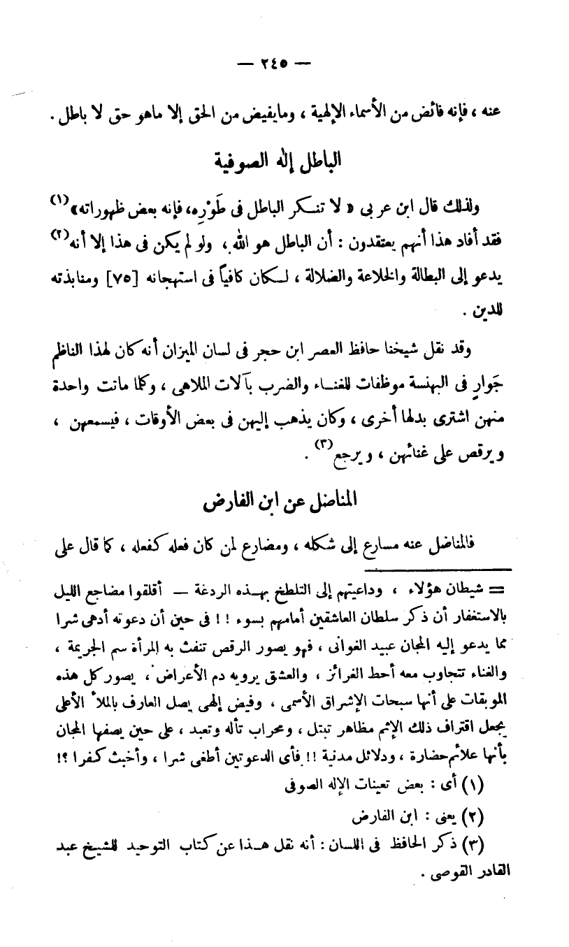 ولذلك قال ابن عربي "لا تنكر الباطل في طوره، فإنه بعض ظهوراته"1 فقد أفاد هذا أنهم يعتقدون: أن الباطل هو الله، ولو لم يكن في هذا إلا أنه2 يدعو إلى البطالة والخلاعة والضلالة، لكان كافيا في استهجانه [75] ومنابذته للدين.