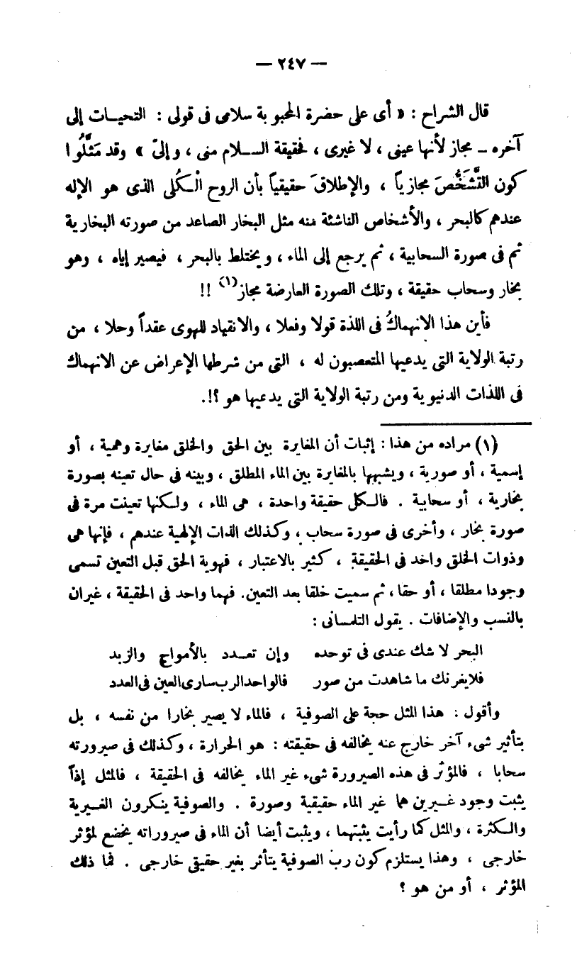 وأقول: هذا المثل حجة على الصوفية، فالماء لا يصير بخارا من نفسه، بل بتأثير شيء آخر خارج عنه يخالفه في حقيقته: هو الحرارة، وكذلك في صيرورته سحابا، فالمؤثر في هذه الصيرورة شيء غير الماء يخالفه في الحقيقة، فالمثل إذا يثبت وجود غيرين هما غير الماء حقيقية وصورة. والصوفية ينكرون الغيرية والكثرة، والمثل كما رأيت يثبتهما، ويثبت أيضا أن الماء في صيروراته يخضع لمؤثر خارجي، وهذا يستلزم كون رب الصوفية يتأثر بغير حقيقي خارجي. فما ذلك المؤثر، أو من هو؟