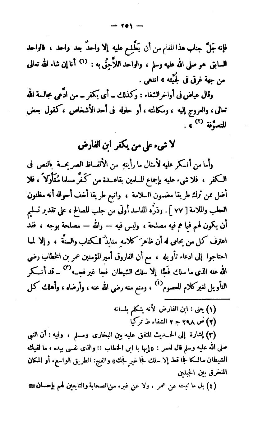 وأما من أنكر عليه لأمثال ما رأيته من الألفاظ الصريحة بالنص في الكفر، فلا شيء عليه بإجماع المسلمين بقاعدة من كفر مسلما متأولا، فلا أضل ممن ترك طريقا مضمون السلامة، واتبع طريقا أخف أحواله أنه مظنون العطب والملامة [77] ودرء المفاسد أولى من جلب المصالح، على تقدير تسليم أن يكون لهم فيما هم فيه مصلحة، ولي فيه -والله- مصلحة بوجه، فقد اعترف كل من يحامي له أن ظاهر كلامه منابذ للكتاب والسنة, وإلا لما احتاجوا إلى ادعاء تأويله، مع أن الفاروق أمير المؤمنين عمر بن الخطاب رضي الله عنه الذي ما سلك فجا إلا سلك الشيطان فجا غير فجه3, قد أنكر التأويل لغير كلام المعصوم4، ومنع منه رضي الله عنه، وأرضاه، وأهلك كل