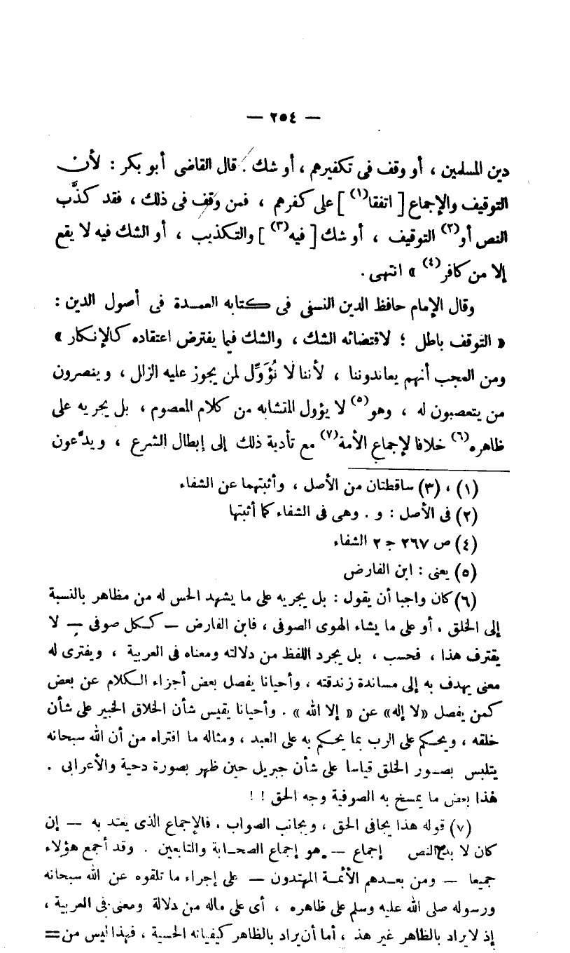 وقال الإمام حافظ الدين النسفي في كتابه العمدة في أصول الدين: "التوقف باطل؛ لاقتضائه الشك، والشك فيما يفترض اعتقاده كالإنكار" ومن العجب أنهم يعاندوننا، لأننا لا نؤول لمن يجوز عليه الزلل، وينصرون من يتعصبون له، وهو5 لا يؤول المتشابه من كلام المعصوم، بل يجريه على ظاهره6 خلافا لإجماع الأمة7 مع تأدية ذلك إلى إبطال الشرع، ويدعون