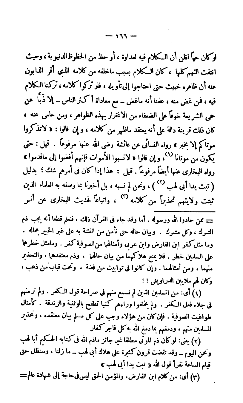 2 يعني: لو كان ذم الموتى مطلقا غير جائز ما ذم الله في كتابه الحكيم: أبا لهب ونحن اليوم -وقد تقضت قرون كثيرة على هلاك أبي لهب- ما زلنا، وسنظل حتى قيام الساعة نقرأ قول الله: {تَبَّتْ يَدَا أَبِي لَهَبٍ} .