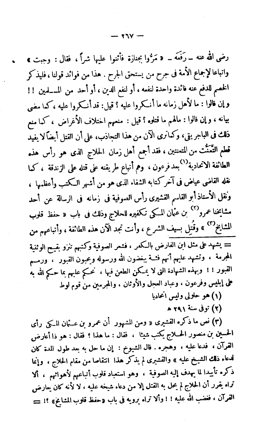 رضي الله عنه -رفعه- "مرو بجنازة فأثنوا عليها شرا، فقال: "وجبت" واتباعا لإجماع الأمة في جرح من يستحق الجرح. هذا من فوائد قولنا، فليذكر الخصم للدفع عنه فائدة واحدة لنفعه، أو لنفع الدين, أو أحد من المسلمين!! وإن قالوا: ما لأهل زمانه ما أنكروا عليه؟ قيل: قد أنكروا عليه، كما مضى بيانه، وإن قالوا: ما لهم ما قتلوه؟ قيل: منعهم اختلاف الأغراض، كما منع ذلك في الباجريقي، وكما ترى الآن من هذا التجاذب، على أن القتل أيضا لا يفيد قطع التعنت من المتعنتين، فقد أجمع أهل زمان الحلاج الذي هو رأس هذه الطائفة الاتحادية1 بعد فرعون، وهم أتباع طريقته على قتله على الزندقة، كما نقله القاضي عياض في آخر كتابه الشفاء الذي هو من أشهر الكتب وأعظمها, ونقل الأستاذ أبو القاسم القشيري رأس الصوفية في زمانه في الرسالة عن أحد مشياخنا عمرو2 بن عثمان المكي تكفيره للحلاج وذلك في باب "حفظ قلوب المشايخ3 وقتل بسيف الشرع، وأنت تجد الآن هذه الطائفة، وأتباعهم من