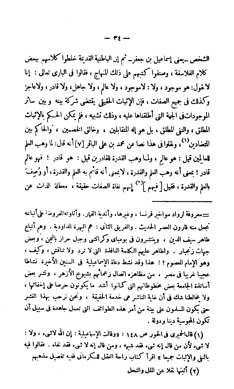 = معروفة لرواد مواخير فرنسا، وغيرها، وأندية القمار. وأتاوته المفروضة على أتباعه تجعل منه قارون العصر الحديث. والفريق الثاني: هم البهرة الداودية. وهم أتباع طاهر سيف الدين، وينتشرون في بومباي وكراتشي وجبل حراز باليمن، وبعض جهات زنجبار. ولطاهر عليهم الكلمة النافذة التي لا ترد ولا تناقش، وكيف، وهو الإمام المعصوم؟ هذا وقد نشط دعاة الإسماعيلية في السنين الأخيرة نشاطا عجيبا غريبا في مصر، من مظاهره اتصال زعمائهم بشيوخ الأزهر، ونشر بعض أساتذة الجامعة بعض مخطوطاتهم التي كانوا أشد ما يكونون حرصا على إخفائها، ولا يخالطنا شك في أن غاية الناشر هي خدمة الحقيقة، ونحن نرحب بهذا النشر حتى يكون المسلمون على بينة من أمر هذه الطوائف التي تعمل جاهدة في سبيل أن تكون المجوسية دينا ودولة.