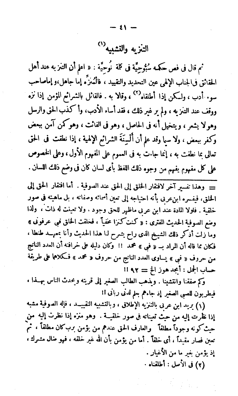 1 يريد ابن عربي بالتنزيه الإطلاق، وبالتشبيه التقييد، فإله الصوفية مشبه إذا نظرت إليه من حيث تعيناته في صور خلقية. وهو منزه إذا نظرت إليه من حيث كونه وجودا مطلقا, والعارف الحق عندهم من يؤمن برب كان مطلقا، ثم تعين فصار مقيدا، أي: خلقا. أما من يؤمن بأن الله غير خلقه، فهو ضال مشرك، إذ يؤمن بغير ما من الأغيار.