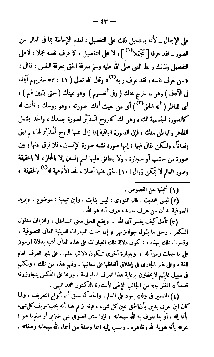 3 تأمل كيف يفسر آي الله، ويضع للحق معنى الباطل، وللإيمان مدلول الكفر. وحق ما يقول جولدزيهر "إذا حملت العبارات الدينية المعاني التصوفية، وفسرت تلك بهذه، تكون دلالة تلك العبارات على هذه المعاني أشبه بدلالة الرموز على ما جعلت رمزا له، وبعبارة أخرى تكون دلالتها عليها على غير العرف العام للغة، وعلى غير الجاري في إطلاق ألفاظها على معانيها، وفهم هذه من تلك، ولكنهم في سبيل غايتهم لا يحفلون برعاية هذا العرف العام للغة، وربما على العكس يتجاوزونه قصدا" انظر جـ2 من الجانب الإلهى لأستاذنا الدكتور محمد البهي.