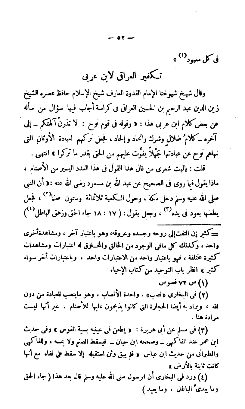 وقال شيخ شيوخنا الإمام القدوة العارف شيخ الإسلام حافظ عصره الشيخ زين الدين عبد الرحيم بن الحسين العراقي في كراسة أجاب فيها سؤال من سأله عن بعض كلام ابن عربي هذا: "وقوله في قوح نوح: لا تذرن آلهتكم -إلى آخره- كلام ضلال وشرك واتحاد وإلحاد، فجعل تركهم لعبادة الأوثان التي نهاهم نوح عن عبادتها جهلا يفوت عليهم من الحق بقدر ما تركوا" ا. هـ.