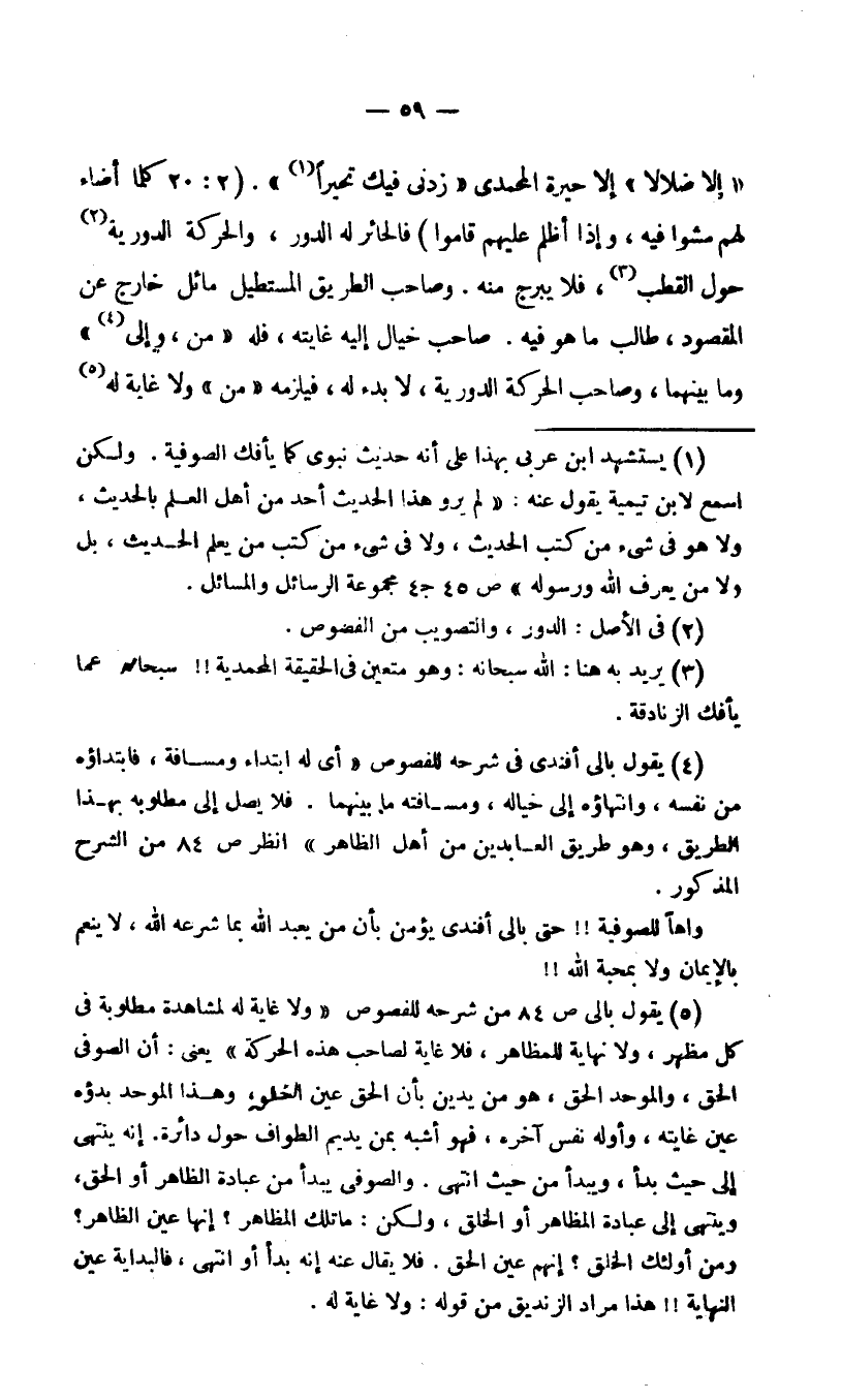 5 يقول بالي ص84 من شرحه للفصوص "ولا غاية له لمشاهدة مطلوبة في كل مظهر، ولا نهاية للمظاهر، فلا غاية لصاحب هذه الحركة" يعني: أن الصوفي الحق، والموحد الحق، هو من يدين بأن الحق عين الخلق، وهذا الموحد بدؤه عين غايته، وأوله نفس آخره، فهو أشبه بمن يديم الطواف حول دائرة. إنه ينتهي إلى حيث بدأ، ويبدأ من حيث انتهى. والصوفي يبدأ من عبادة الظاهر أو الحق، وينتهي إلى عبادة المظاهر أو الخلق، ولكن: ما تلك المظاهر؟ إنها عين الظاهر؟ ومن أولئك الخلق؟ إنهم عين الحق. فلا يقال عنه إنه بدأ أو انتهى، فالبداية عين النهاية!! هذا مراد الزنديق من قوله: ولا غاية له.