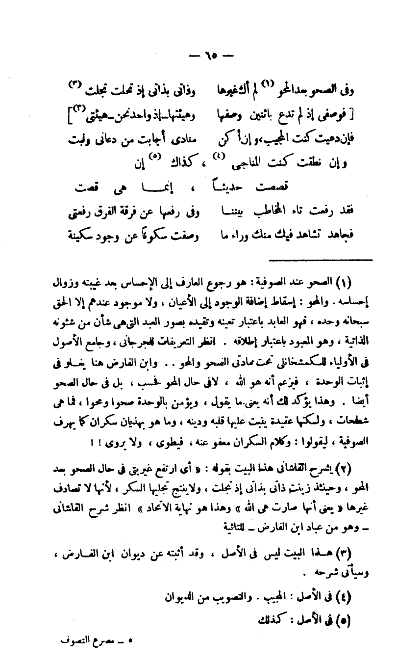 2 يشرح القاشاني هذا البيت بقوله: "أي: ارتفع غيريتي في حال الصحو بعد المحو، وحينئذ زينت ذاتي بذاتي إذ تجلت، ولا ينتج تجليها السكر، لأنها لا تصادف غيرها" يعني أنها صارت هي الله" وهذا هو نهاية الاتحاد" انظر شرح القاشاني -وهو من عباد ابن الفارض- للتائية.