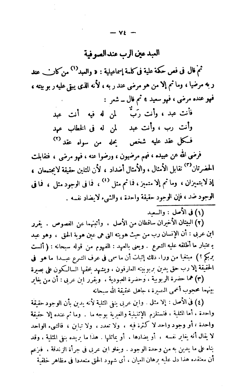ثم قال في فص كلمه علية في كلمة إسماعيلية: "والعبد1 من كان عند ربه مرضيا، وما ثم إلا من هو مرضي عند ربه؛ لأنه الذي يبقي عليه ربوبيته، فهو عنده مرضي فهو سعيد": ثم قال؛ شعر: