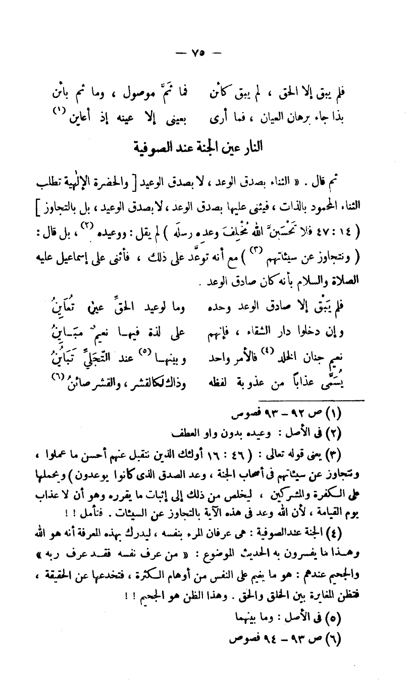 ثم قال: "الثناء بصدق الوعد, لا بصدق الوعيد [والحضرة الإلهية تطلب الثناء المحمود بالذات، فيثني عليها بصدق الوعد، لا بصدق الوعيد، بل بالتجاوز] {فَلا تَحْسَبَنَّ اللَّهَ مُخْلِفَ وَعْدِهِ رُسُلَهُ} [إبراهيم: 47] لم يقل: ووعيده2، بل قال: {وَنَتَجَاوَزُ عَنْ سَيِّئَاتِهِمْ 3} مع أنه توعد على ذلك، فأثنى على إسماعيل عليه الصلاة والسلام بأنه كان صادق الوعد.