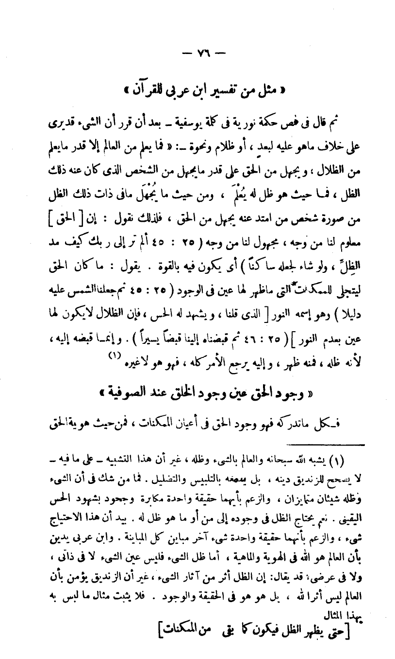 ثم قال في نص حكمة نورية في كلمة يوسفية, بعد أن قرر أن الشيء قد يرى في خلاف ما هو عليه لبعد، أو ظلام ونحوه: "فما يعلم من العالم إلا قدر ما يعلم من الظلال، ويجهل من الحق على قدر ما يجهل من الشخص الذي كان عنه ذلك الظل، فما حيث هو ظل له يعلم، ومن حيث ما يجهل ما في ذات ذلك الظل من صورة شخص من امتد عنه يجهل من الحق، فلذلك نقول: إن [الحق] معلوم لنا من وجه, مجهول لنا من وجه {أَلَمْ تَرَ إِلَى رَبِّكَ كَيْفَ مَدَّ الظِّلَّ وَلَوْ شَاءَ لَجَعَلَهُ سَاكِنًا} [الفرقان: 45] أي: يكون فيه بالقوة. يقول: ما كان الحق ليتجلى للممكنات التي ما ظهر لها عين في الوجود {ثُمَّ جَعَلْنَا الشَّمْسَ عَلَيْهِ دَلِيلًا} [الفرقان: 45] وهو اسمه النور [الذي قلنا، ويشهد له الحسن, فإن الظلال لا يكون لها عين بعدم النور] {ثُمَّ قَبَضْنَاهُ إِلَيْنَا قَبْضًا يَسِيرًا} [الفرقان: 46] . وإنما قبضه إليه؛ لأنه