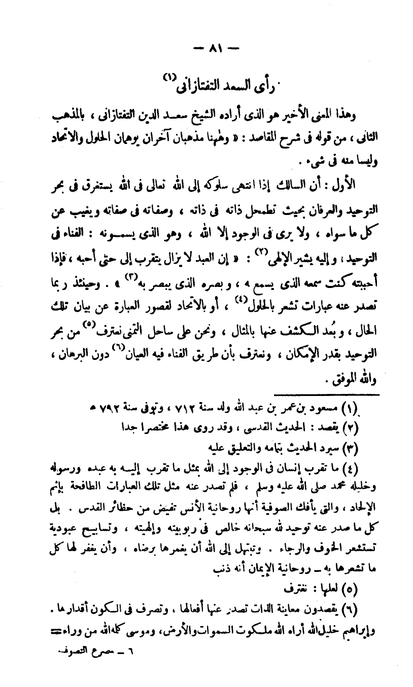 الأول: أن السالك إذا انتهى سلوكه إلى الله تعالى في الله يستغرق في بحر التوحيد والعرفان بحيث تطمحل ذاته في ذاته، وصفاته في صفاته ويغيب عن كل ما سواه، ولا يرى في الوجود إلا الله، وهو الذي يسمونه: الفناء في التوحيد، وإليه يشير الإلهي2: "إن العبد لا يزال يتقرب إليّ حتى أحبه، فإذا أحببته كنت سمعه الذي يسمع به، وبصره الذي يبصر به3". وحينئذ ربما تصدر عنه عبارات تشعر بالحلول4، أو بالاتحاد لقصور العبارة عن بيان تلك الحال، وبعد الكشف عنها بالمثال، ونحن على ساحل التمني نعترف5 من بحر التوحيد بقدر الإمكان، ونعترف بأن طريق الفناء فيه العيان6 دون البرهان، والله الموفق.