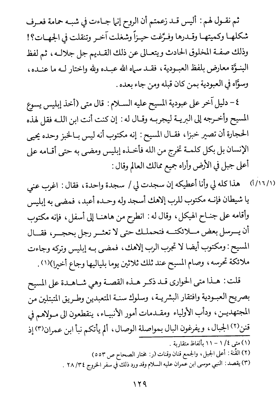 قلت: هذا متى الحواري قد ذكر هذه القصة وهي شاهدة على المسيح بصريح العبودية وافتقار البشرية، وسلوك سنة المتعبدين وطريق المتبتلين من المجتهدين، وأدب الأولياء ومقدمات أمور الأنبياء، ينقطعون إلى مولاهم في قنن2 الجبال، ويفرغون البال بمواصلة الوصال، ألم يأتكم نبأ ابن عمران3 إذ