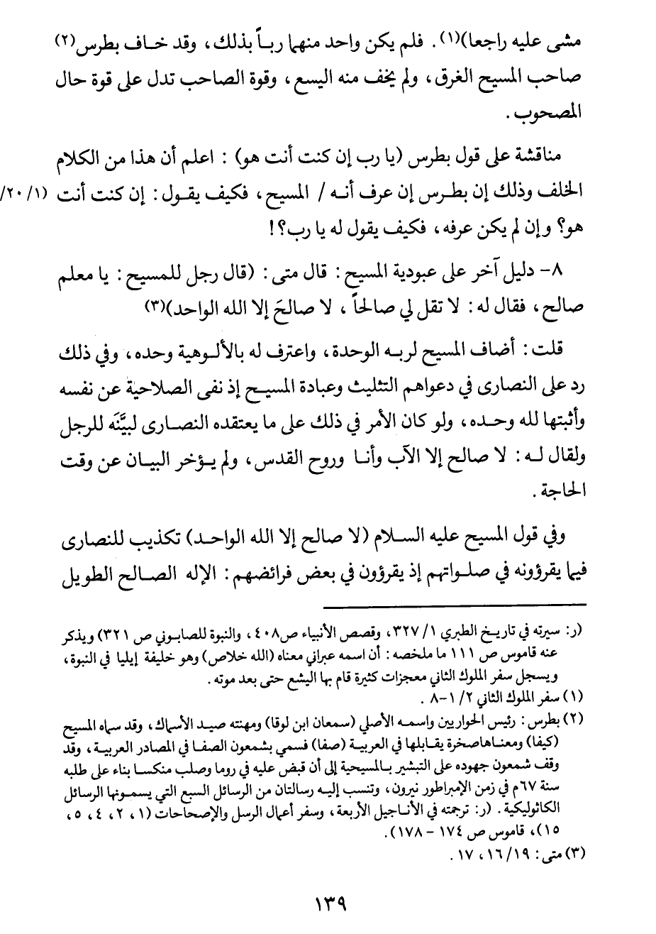 قلت: أضاف المسيح لربّه الوحدة، واعترف له بالألوهية وحده، وفي ذلك ردٌّ على النصارى في دعواهم التثليث وعبادة المسيح إذ نفى الصلاحية عن نفسه وأثبتها لله وحده، ولو كان الأمر في ذلك على ما يعتقده النصارى لبيَّنه للرجل ولقال له: لا صالح إلاّ الأب وأنا روح القدس، لم يؤخر البيان عن وقت الحاجة.