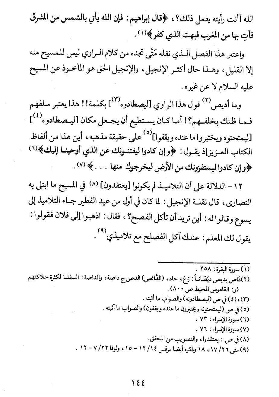 وما أديص1 قول هذا الراوي [ليصطادوه] 2 بكلمة!! هذا يعتبر سلفهم فما ظنّك بخلفهم؟! أما كان يستطيع أيجعل مكان [ليصطادوه] 3 [ليمتحنوه ويختبروا ما عنده ويقفوا] 4 على حقيقة مذهبه، أين هذا من ألفاظ الكتاب العزيز إذ يقول: {وَإِنْ كَادُوا لَيَفْتِنُونَكَ عَنِ الَّذِي أَوْحَيْنَا إِلَيكَ} . [سورة الإسراء، الآية: 73] . {وَإِن كَادُوا لَيَسْتَفِزُّونَكَ مِنَ الأَرْضِ لِيُخْرِجُوكَ مِنْهَا ... } . [سورة الإسراء، الآية: 76] .