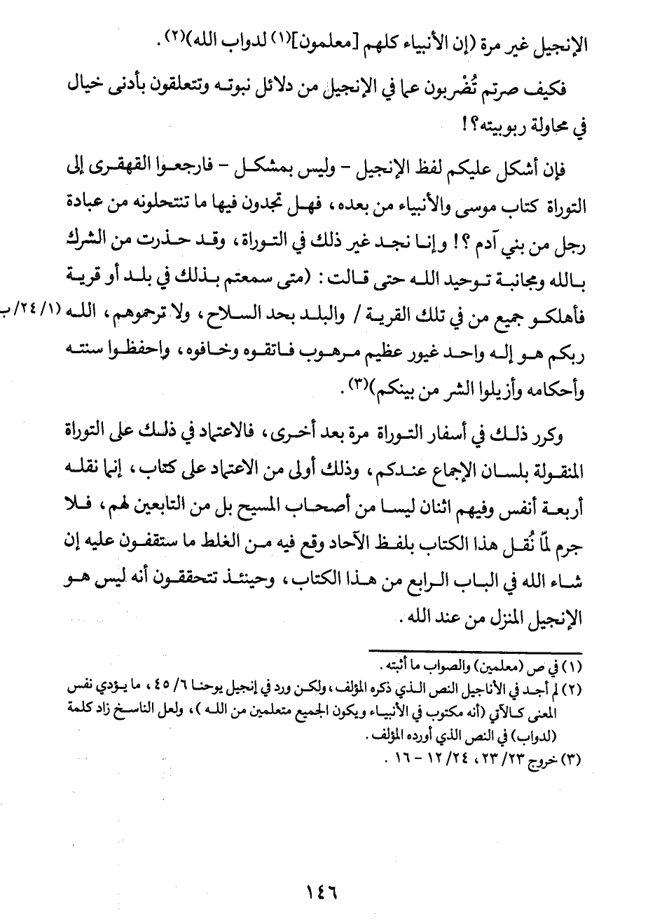 وكرر ذلك في أسفار التوراة مرة بعد أخرى، فالاعتماد في ذلك على التوراة المقولة بلسان الإجماع عندكم، وذل أولى من الاعتماد على كتاب، إنما نقله أربعة أنفس وفيهم اثنان ليسا من أصحاب المسيح بل من التابعين لهم، فلا جرم لمّا نُقل هذا الكتاب بلفظ الآحاد وقع فيه من الغلط ما ستقفون عليه إن شاء الله في الباب الرابع من هذا الكتاب. وحينئذ تتحققون أنه ليس هو الإنجيل المنَزَّل من عند الله.