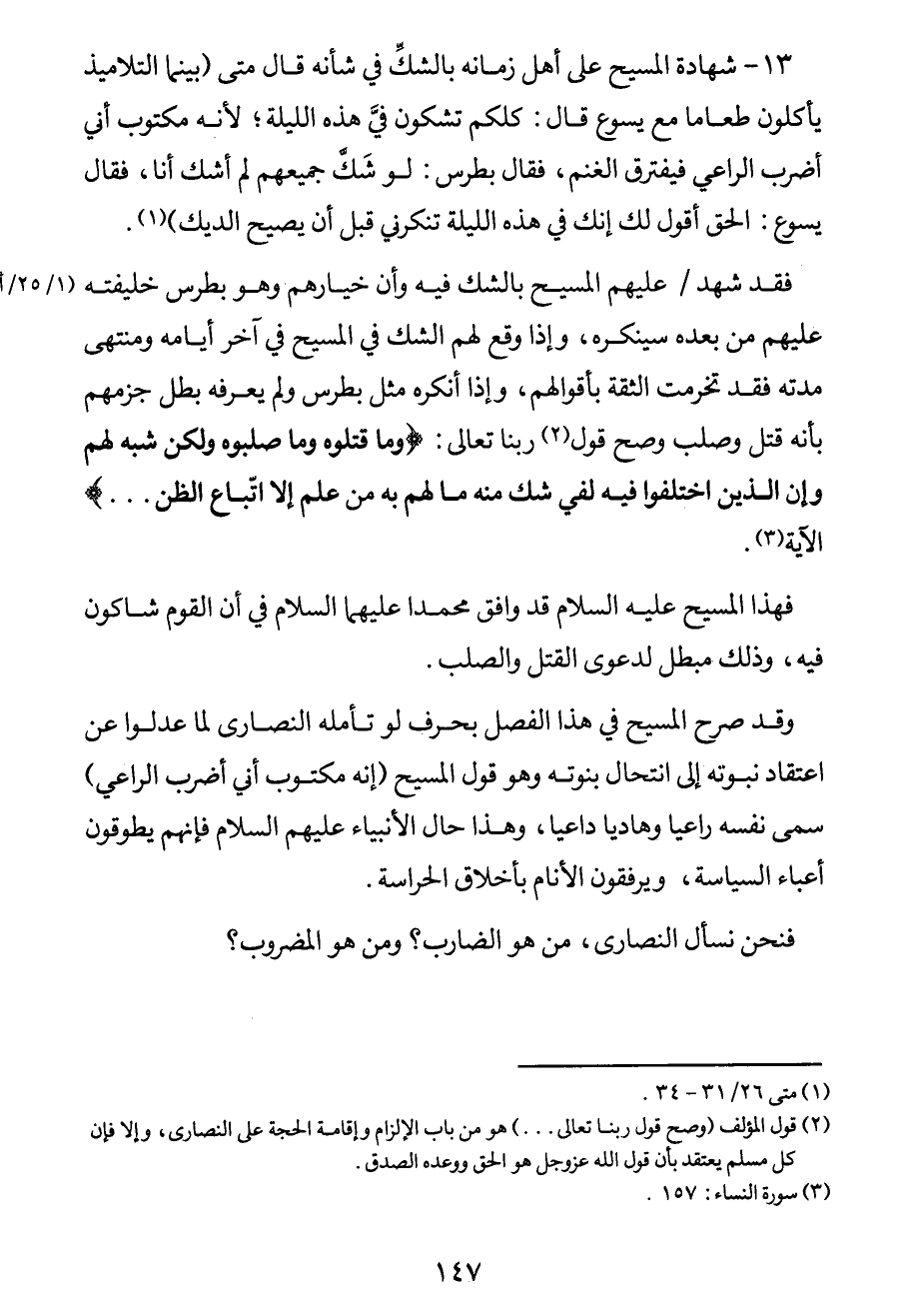 2 قول المؤلف: "وصحّ قول ربنا تعالى ... "، هو من باب الإلزام وإقامة الحجة على النصارى. وإلاّ فإن كلّ مسلم يعتقد بأن قول الله عزوجل هو الحقّ ووعده الصدق.