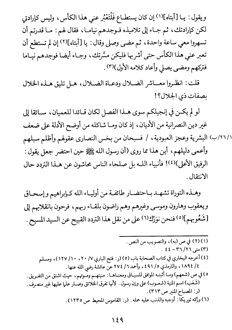 لو لم يكن في إنجيلكم سوى هذا الفصل لكان قائداً للعميان، سائقاً إلى غير دين النصرانية من الأديان، إذ كان وما شاكله من أوضح الأدلة على ضعف البشرية وعجز العبودية، / (1/26/ب) فسبحان من بخس النصارى عقولهم وأظلم سبلهم وأعمى دليلهم، أين هذا مما روى "أن رسول الله صلى الله عليه وسلم حين احتضر جعل يقول: الرفيق الأعلى"! 4. فأنبياء الله بل صلحاء الناس محاشون عن هذا التردّد حال الانتقال.