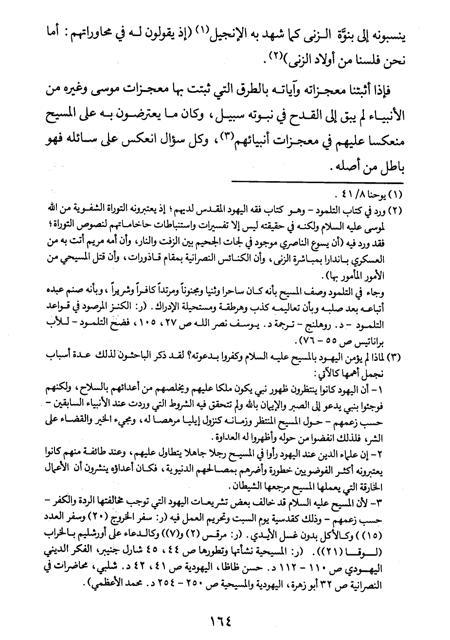 فإذا أثبتنا معجزاته وآياته بالطرق التي ثبتت بها معجزات موسى وغيره من الأنبياء لم يبق إلى القدح في نبوّته سبيل، وكان ما يعترضون به على المسيح منعكساً عليهم في معجزات أنبيائهم3، وكلّ سؤال انعكس على سائله فهو باطل من أصله.