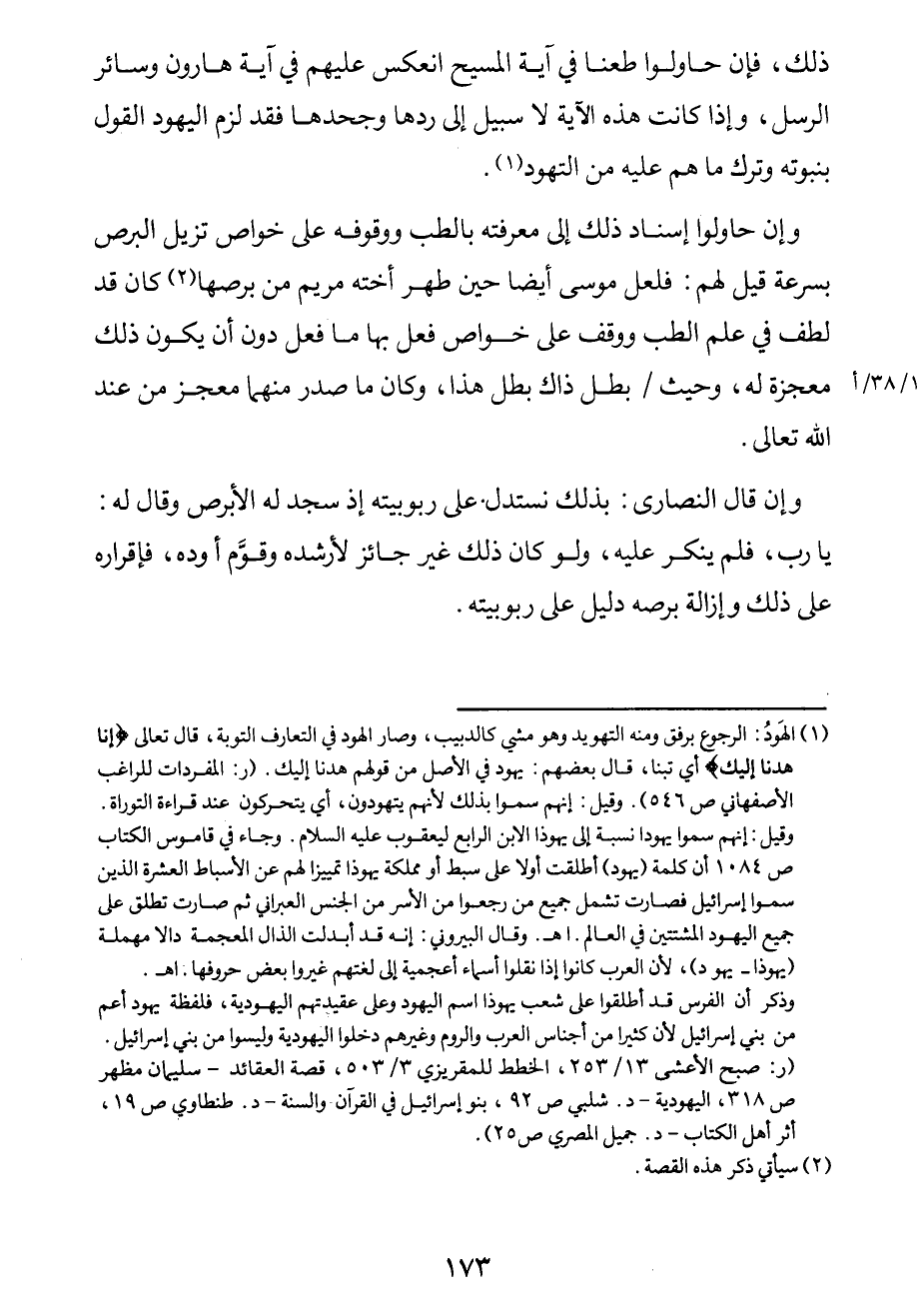 وإن حاولوا إسناد ذلك إلى معرفته بالطبّ ووقوفه على خواص تزيل البرص بسرعة، قيل لهم: فلعل موسى أيضاً حين طهر أخته مريم من برصها2 كان قد لطف في علم الطبّ ووقف على خواص فعل بها ما فعل دون أن يكون ذلك معجزة له، وحيث / (1/38/أ) بطل ذاك بطل هذا، وكان ما صدر منهما معجزة من عند الله تعالى.