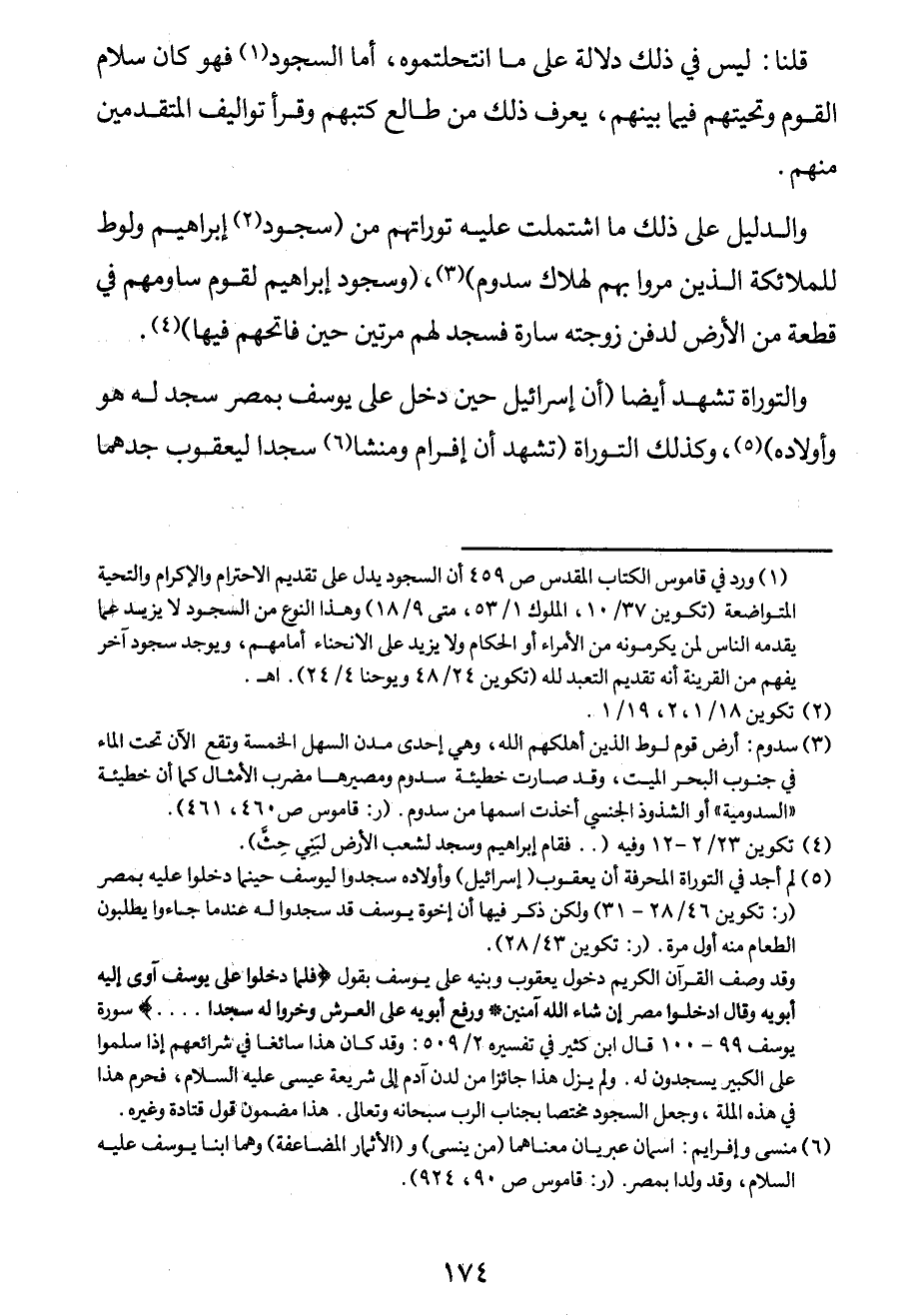 والدليل على ذلك ما اشتملت عليه توراتهم من "سجود2 إبراهيم ولوط للملائكة الذين مرّوا بهم لهلالك سدوم"3. "وسجود إبراهيم لقم ساومهم في قطعة من الأرض لدفن زوجته سارة فسجد لهم مرتين حين فاتحهم فيها"4.