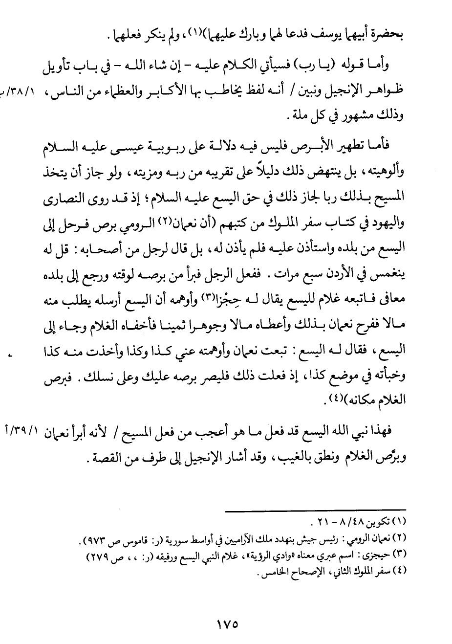 فأما تطهير الأبرص فليس فيه دلالة على ربوبية عسى عليه السلام وألوهيته، بل ينتهض ذلك دليلاً على تقريبه من ربّه ومزيته، ولو جاز أن يتخّذ المسيح بذلك ربّاً لجاز ذلك في حقّ اليسع عليه السلام؛ إذ قد روى النصارى واليهود في كتاب سفر الملوك من كتبهم: "أن نعمان2 الرومي برص فرحل إلى اليسع من بلده واستأذن عليه فلم يأذن له، بل قال لرجل من أصحابه: "قل له ينغمس في الأردن سبع مرات"، ففعل الرجل فبرأ من برصه لوقته ورجع إلى بلده معافى فاتبعه غلام للمسيح يقال له: (حِجْزا) 3 وأوهمه أن المسيح أرسله يطلب منه مالاً ففرح نعمان بذلك وأعطاه مالاً وجوهراً ثميناً فأخفاه الغلام وجاء إلى اليسع، فقال له اليسع: تبعت نعمان وأوهمته عني كذا وكذا، وأخذت منه كذا وخبأته في موضع "كذا، إذ فعلت ذلك فليصر برصه عليك وعلى نسلك. فبرص الغلام مكانه"4.