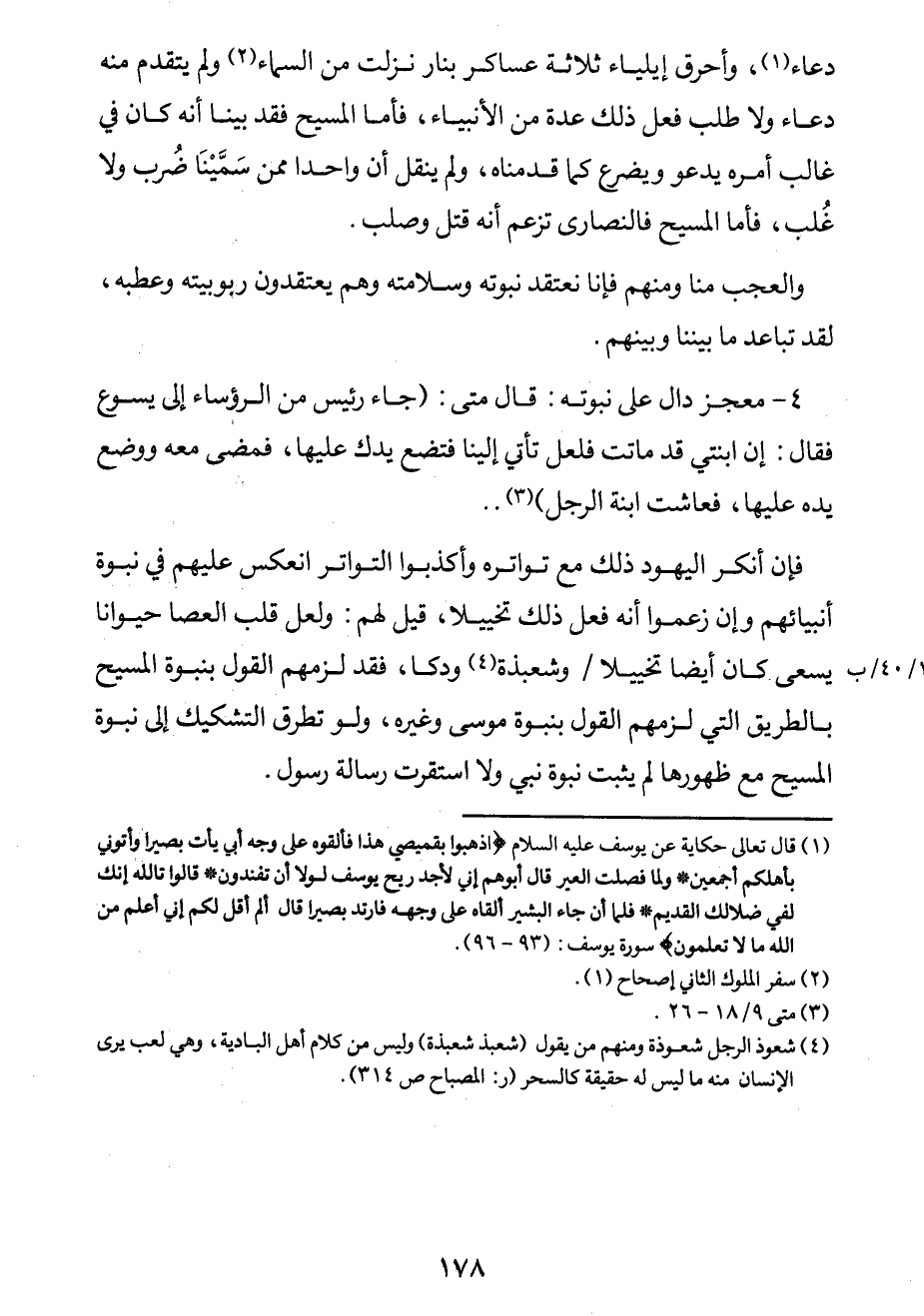 فإن أنكر اليهود ذلك مع تواتره وأكذبوا التواتر انعكس عليهم في نبوة أنبيائهم وإن زعموا أنه فعل ذلك تخييلاً، قيل لهم: ولعل قلب العصا حيواناً يسعى كان أيضاً تخييلاً / (1/40/ب) وشعبذة4 ودكا، فقد لزمهم القول بنبوة المسيح بالطريق التي لزمهم القول بنبوة موسى وغيره. ولو تطرق التشكيك إلى نبوة المسيح مع ظهورها لم يثبت نبوة نبيٍّ ولا استقرت رسالة رسول.