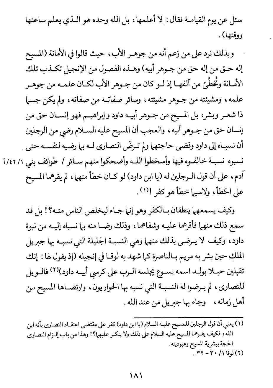 وبذلك نرد على من زعم أنه من جوهر الأب، حيث قالوا في الأمانة: "المسيح إله حقّ من إله حقّ من جوهر أبيه". وهذه الفصول من الإنجيل تكذب تلك الأمانة وتُخطِّئ من ألفها إذ لو كان من جوهر الأب لكان علمه من جوهر عمله، ومشيئته من جوهر مشيئته، وسائر صفاته من صفاته، ولم يكن جسماً ذا شعر وبشر، بل المسيح من جوهر أبيه داود وإبراهيم فهو إنسان حقّ من إنسان حقّ من جوهر أبيه، والعجب أن المسيح عليه السلام رضي من الرجلين أن نسباه إلى داود وقضى حاجتهما ولم ترضَ النصارى له بما رضيه لنفسه حتى نسبوه نسبة خالفوه فيها وأسخطوا الله وأضحكوا منهم سائر / (1/42/أ) طوائف آدم، على أن قول الرجلين له: "يا ابن داود" لوكان خطأ منهما، لم يقرّهما المسيح على الخطأ، ولاسيما خطأ هو كفر! 1.