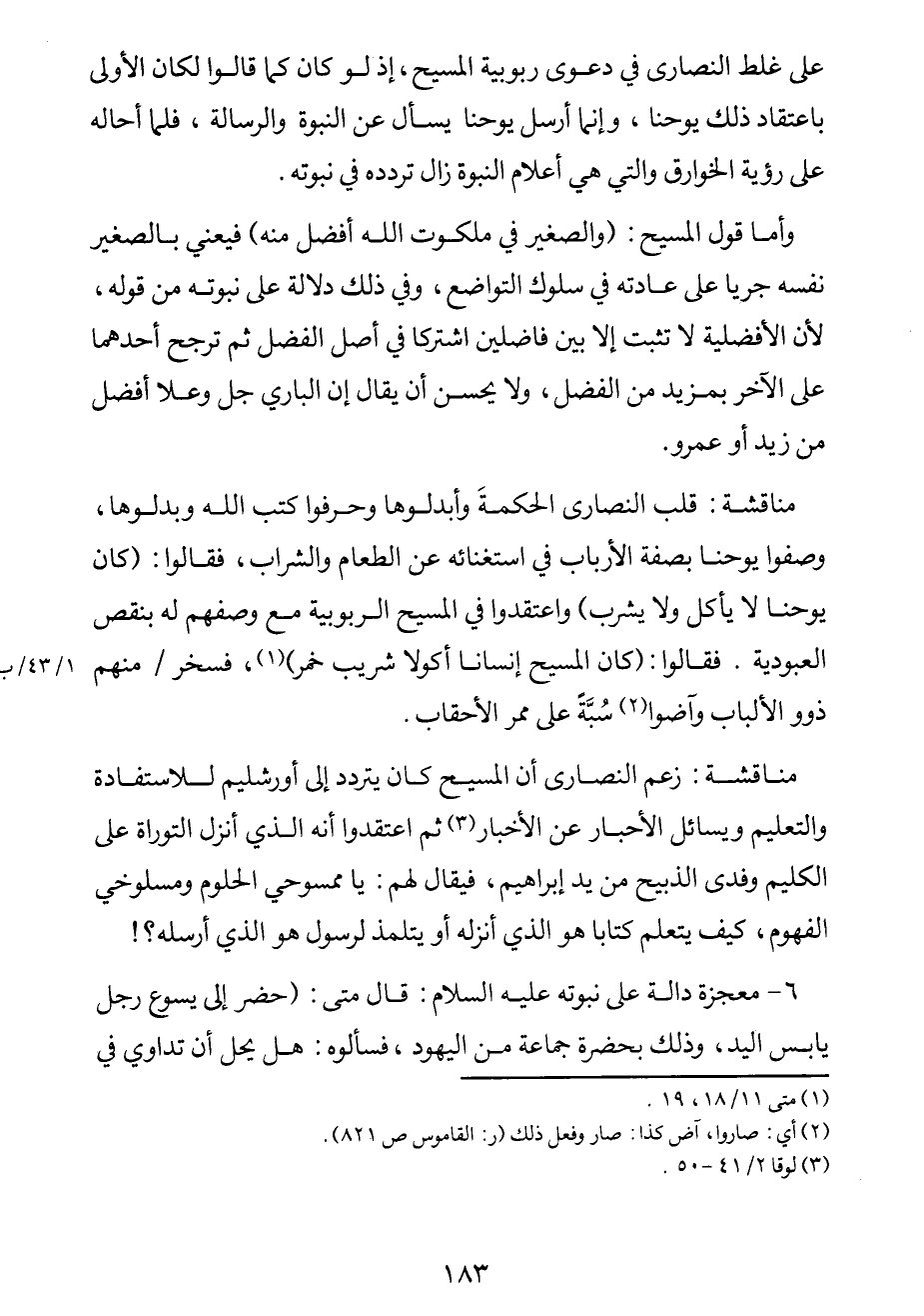مناقشة: قلب النصارى الحكمةَ وأبدلوها وحرفوا كتب الله وبدلّوها، وصفوا يوحنا بصفة الأرباب في استغنائه عن الطعام والشراب، فقالوا: "كان يوحنا لا يأكل ولا يشرب". واعتقدوا في المسيح الربوبية مع وصفهم له بنقص العبودية، فقالوا: "كان المسيح إنساناً أكولاً شريب خمر"1. فسخر / (1/43/ب) منهم ذووا الألباب وآضوا2 سُبَّةً على ممرّ الأحقاب.