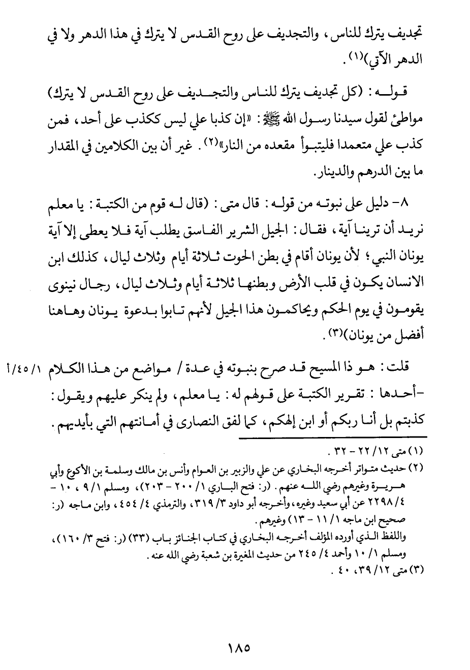قوله: "كل تجديف يترك للناس والتجديف على روح القدس لا يترك"، مواطئ لقول سيدنا رسول الله صلى الله عليه وسلم: "إن كذباً عليّ ليس ككذب على أحد، فمن كذب عليَّ متعمداً فليتبوّأ مقعده من النار "2. غير أن بين الكلامين في المقدار ما بين الدرهم والدينار.