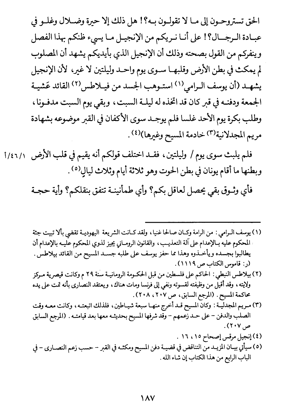 الحقّ تستروحون إلى ما لا تقولون به؟! هل ذلك إلاّ حيرة وضلال وغلو في عبادة الرجال؟! على أنا نريكم من الإنجيل ما يسيء ظنكم بهذا الفصل وينفركم من القول بصحته وذلك أن الإنجيل الذي بأيديكم يشهد أن المصلوب لم يمكث في بطن الأرض وقلبها سوى يوم واحد وليلتين لا غير، لأن الإنجيل يشهد: "إن يوسف الرامي1 استوهب الجسد من فيلاطس2 القائد عَشية الجمعة ودفنه في قبر كان قد اتّخذه له ليلة السبت، وبقي يوم السبت مدفوناً، وطلب بكرة يوم الأحد غلساً فلم يوجد سوى الأكفان في القبر موضوعة بشادة مريم المجدلانية3 خادمة المسيح وغيرها"4.