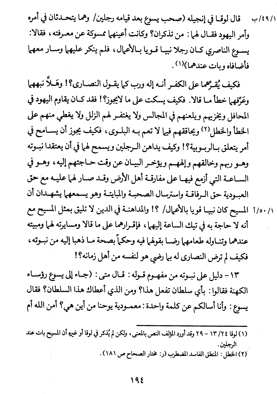فكيف يُقرِّهما على الكفر أنه إله وربّ كما يقول النصارى؟ وهَلاَّ نبههما وعرَّفهما خطأ ما قالا. فكيف يسكت على ما لا يجوز؟! فقد كان يقاوم اليهود في المحافل ويخزيهم ويلعنهم فيالمجالس ولا يغتفر لهم الزلل ولا يغطي منهم على الخطأ والخطل2 ويحاققهم فيما لا تعم به البلوى، فكيف يجوز أن يسامح في أمر يتعلق بالربوبية؟! وكيف يداهن الرجلين ويسمح لهما في أن يعتقدوا نبوته وهو ربهم وخالقهم وإلههم ويؤخر البيان عن وقت حاجتهم إليه، وهو في الساعة التي أزمع فيها على مفارة أهل الأرض وقد صار لهما عليه مع حقّ العبودية حقّ الرفاقة واسترسال الصحبة والمبايتة وهو يسمعهما يشهدان أن المشيح كان نبيّاً قويّاً بالأعمال؟! / (1/50/أ) . والمداهنة في الدين لا تليق بمثل المسيح مع أنه لا حاجة به في تيك الساعة إليهما، فإقرارهما على ما قالا ومسايرته لهما ومبيته عندهما تناوله طعامهما رضا بقولهما فيه وحكماً بصحة ما ذهبا إليه من نبوته، فكيف لم ترض النصارى له بما رضي هو لنفسه من أهل زمانه؟!.