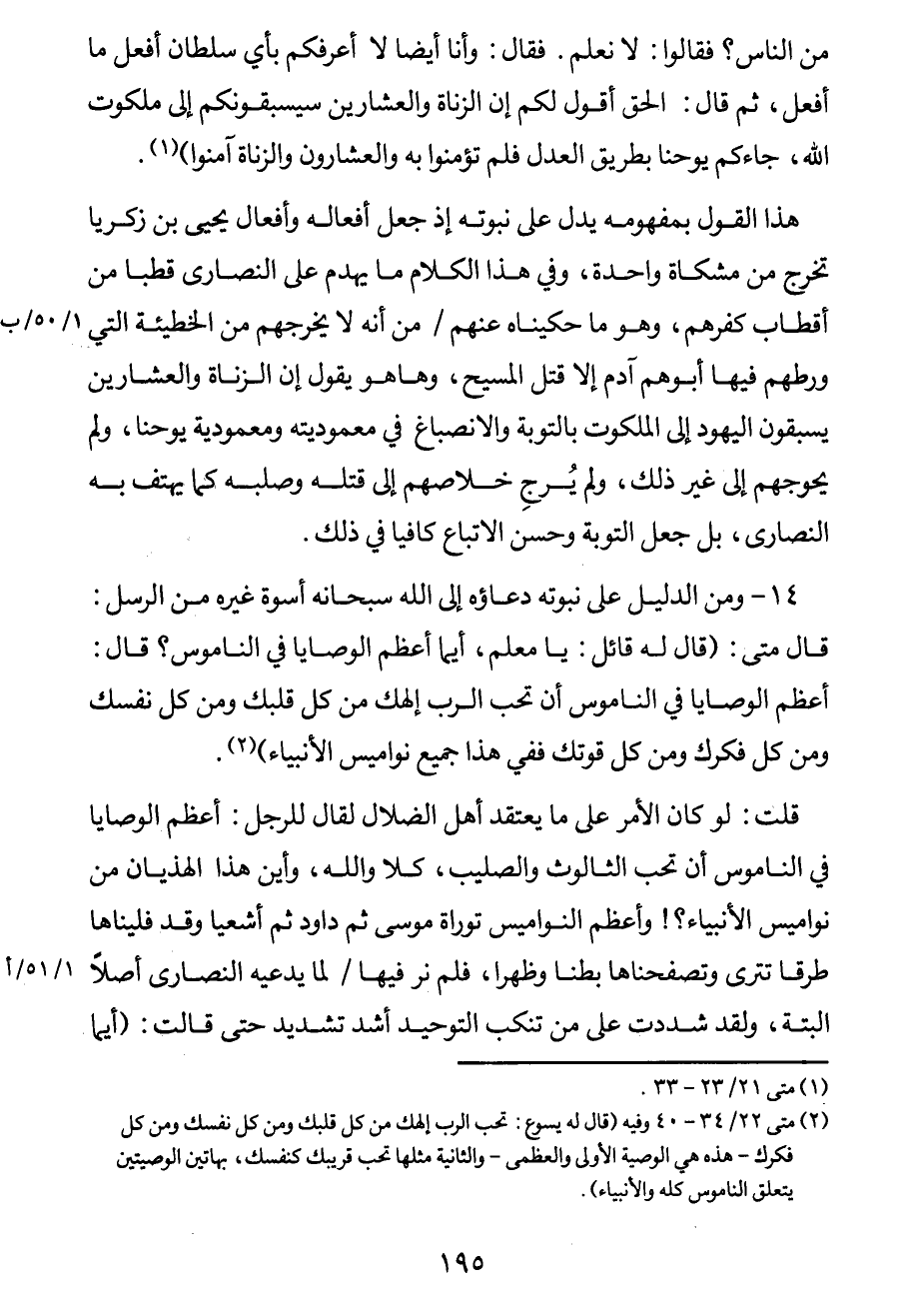 هذا القول بمفهومه يدلّ على بنوته إذ جعل أفعاله وأفعال يحيى بن زكريا تخرج من مشكاة واحدة، وفي هذا الكلام ما يهدم على النصارى قطباً من أقطاب كفرهم، وهو ما حكيناه عنهم / (1/50/ب) من أنه لا يخرجهم من الخطيئة التي ورطهم فيها أبوهم آدم إلاّ قتل المسيح، وها هو يقول إن الزناة والعشارين يسبقون اليهود إلى الملكوت بالتوبة والانصباغ في معموديته ومعمودية يوحنا، ولم يحوجهم إلى غير ذلك، ولم يُرجِ خلاصهم إلى قتله وصلبه كما يهتف به النصارى، بل جعل التوبة وحسن الاتباع كافياً في ذلك.