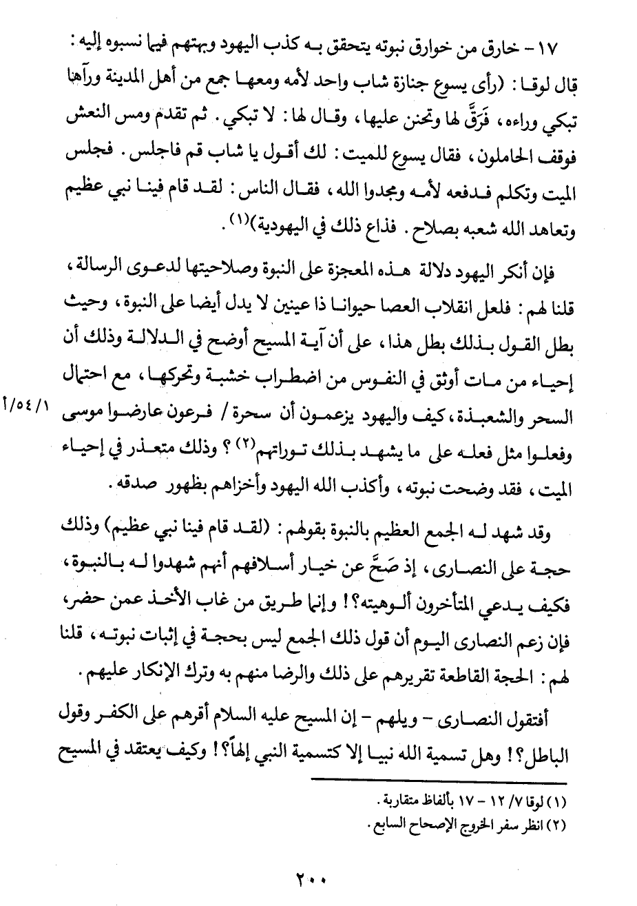 17- خارق من خوارق نبوته يتحقق به كذب اليهود وبهتهم فيما نسبوه إليه: قال لوقا: "رأى يسوع جنازة شاب واحد لأمه ومعها جمع من أهل المدينة ورآها تبكي وراءه، فَرَقَّ لها وتحنن عليها، وقال لها: لا تبكي. ثم تقدم ومس النعش فوقف الحاملون، فقال يسوع للميت: لك أقول يا شاب قم فاجلس. فجلس الميت وتكلم فدفعه لأمه ومجدوا الله، فقال الناس: لقد قام فينا نبيّ عظيم وتعاهد الله شعبه بصلاح. فذاع ذلك اليهودية"1.