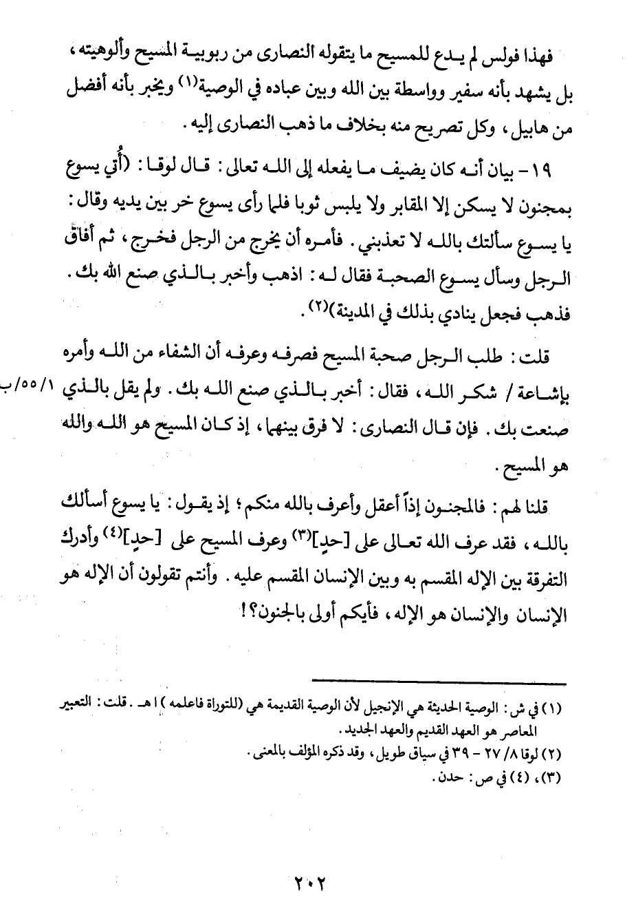 قلنا لهم: فالمجنون إذاً أعقل وأعرف بالله منكم؛ إذ يقول: يا يسوع أسألك بالله، فقد عرف الله تعال على [حدً] 3 وعرف المسيح على [حدٍ] 4 وأدرك التفرقة بين الإله المقسم به وبين الإنسان المقسم عليه. وأنتم تقولون إن الإله هو الإنسان والإنسان هو الإله، فأيكم أولى بالجنون؟!.