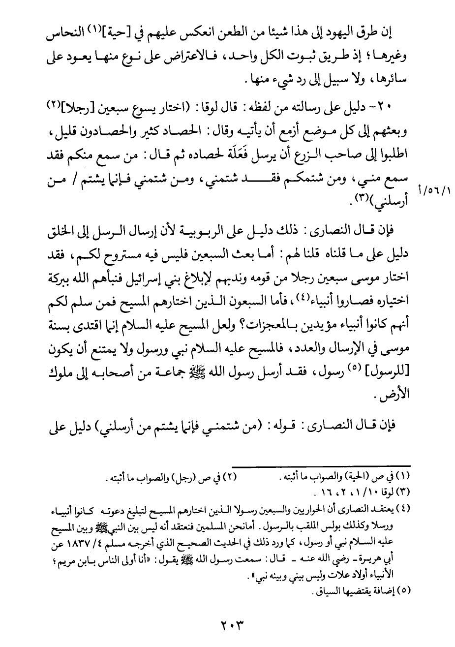20- دليل على رسالته من لفظه، قالو لوقا: "اختار يسوع سبعين [رجلاً] 2 وبعثهم إلى كلّ موضع أزمع أن يأتيه، وقال: الحصاد كثير والحصادون قليل، اطلبوا إلى صاحب الزرع أن يرسل فَعَلَة لحصاده ثم قال: من سمع منكم فقد سمع مني، ومن شتمكم فقد شتمني، ومن شتمني فإنما يشتم / (1/56/أ) مَنْ أَرْسلني"3.