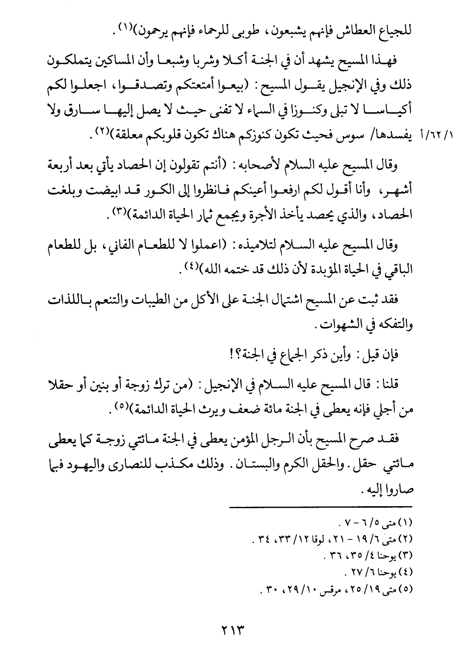 قلنا: قال المسيح عليه السلام في الإنجيل: "من ترك زوجة أو بنين أو حقلاً من أجلي فإنه يعطى في الجنة مائة ضعف ويرث الحياة الدائمة"5.