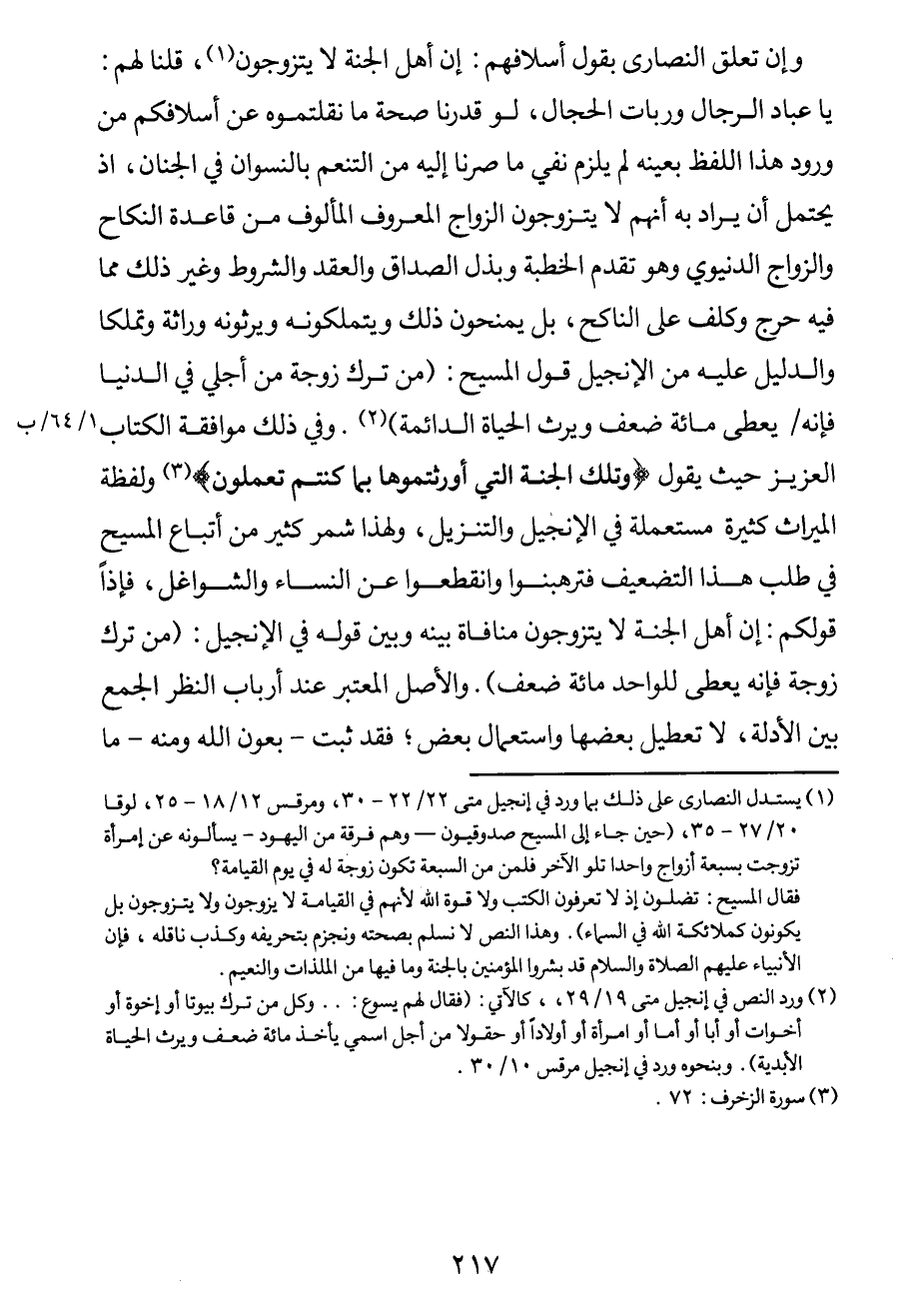وإن تعلق النصارى بقول أسلافهم: إن أهل الجنة لا يتزوجون1. قلنا لهم: يا عباد الرجال وربات الحجال، لو قدرنا صحة ما نقلتموه عن أسلافكم من ورود هذا اللفظ بعينه لم يلزم نفي ما صرنا إليه من التنعم بالنسوان في الجنان، إذ يحتمل أن يراد به أنهم لا يتزوجون الزواج المعروف المألوف من قاعدة النكاح والزواج الدنيوي وهو تقدم الخطبة وبذل الصداق والعقد والشروط وغير ذلك مما فيه حرج وكلف على الناكح، بل يمنحون ذلك ويتملكونه ويرثونه وراثة وتملكاً والدليل عليه من الإنجيل قول المسيح:"من ترك زوجة من أجلي في الدنيا فإنه/ (1/64/ب) يعطى مائة ضعف ويرث الحياة الدائمة"2. وفي ذلك موافقة الكتاب العزيز حيث يقول: {تِلْكَ الجَنَّةُ الَّتِي أُورِثْتُمُوهَا بِمَا كُنْتُم تَعْمَلُون} . [سورة الزخف، الآية: 72] . ولفظة الميراث كثيرة مستعملة في الإنجيل والتّنْزِيل، ولهذا شمر كثير من أتباع المسيح في طلب هذا التضعيف فترهبنوا وانقطعوا عن النساء والشواغل، فإذاً قولكم: إن أهل الجنة لا يتزوجون منافاة بينه وبين قوله في الإنجيل: "من ترك زوجة فإنه يعط للواحد مائة ضعف". والأصل المعتبر عند أرباب النظر الجمع بين الأدلة، لا تعطيل بعضها واستعمال بعض؛ فقد ثبت - بعون الله ومنه - ما