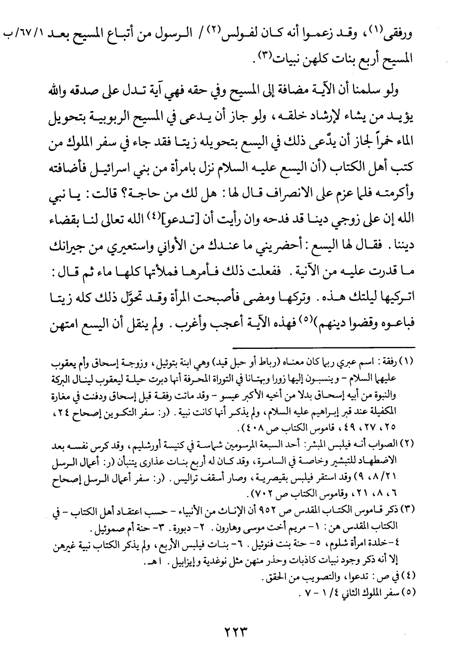 ولو سلمنا أن الآية مضافة إلى المسيح وفي حقه فهي آية تدل على صدقه والله يؤيد من يشاء لإرشاد خلقه، ولو جاز أن يدعي في المسيح الربوبية بتحويل الماء خمراً لجاز أن يدَّعي ذلك في اليسع بتحويله زيتاً فقد جاء في سفر الملوك من كتب أهل الكتاب: "أن اليسع عليه السلام نزل بامرأة من بني إسرائيل فأضافته وأكرمته فلما عزم على الانصراف قال لها: هل لك من حاجة؟ قالت: يا نبي الله إن على زوجي ديناً قد فدحه وإن رأيت أن [تدعو] 4 الله تعالى لنا بقضاء ديننا. فقال لها اليسع: أحضريني ما عندك من الأواني واستعيري من جيرانك ما قدرت عليه من الآنية. ففعلت ذلك فأمرها فملأتها كلّها ماء ثم قال: اتركيها ليلتك هذه. وتركها ومضى فأصبحت المرأة وقد تحوَّل ذلك كلّه زيتاً فباعوه وقضوا دينهم"5. فهذه الآية أعجب وأغرب. ولم ينقل أن اليسع امتهن