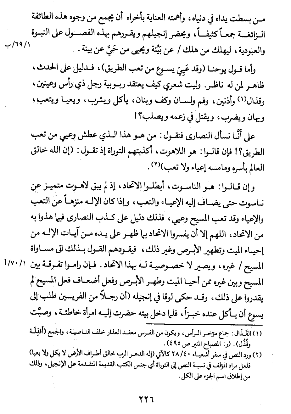 على أَنَّا نسأل النصارى فنقول: من هو هذا الذي عطش وعيي من تعب الطريق؟! فإن قالوا: هو اللاهوت، أكذبتهم التوراة إذ تقول: "إن الله خالق العالم بأسره وما مسه إعياء ولا تعب"2.