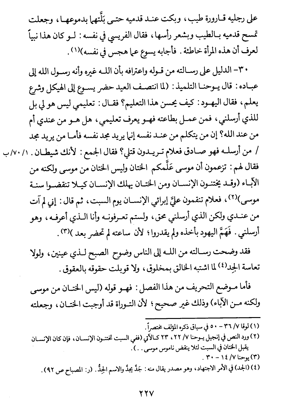 30- الدليل على رسالته من قوله واعترافه بأن الله غيره وأنه رسول الله إلى عباده، قال يوحنا التلميذ: "لما انتصف العيد حضر يسوع إلى الهيكل وشرع يعلم، فقال اليهود: كيف يحسن هذا التعليم؟ فقال تعليمي ليس هو لي بل للذي أرسلني، فمن عمل بطاعته فهو يعرف تعليمي، هل هو من عندي أم من عند الله؟ إن من يتكلم من عند نفسه إنما يريد مجد نفسه. فأما من يريد مجد/ (1/70/ب) من أرسله فهو صادق فعلام تريدون قتلي؟ فقال الجمع: لأنك شيطان. فقال لهم: تزعمون أن موسى عَلَّمكم الختان وليس الختان من موسى ولكنه من الآباء: "وقد يختنون الإنسان ومن الختان يهلك الإنسان كيلا تنقضوا سنة موسى"2. فعلام تنقمون عليَّ إبرائي الإنسان يوم السبت، ثم قال: إني لم آت من عندي ولكن الذي أرسلني محقّ، ولستم تعرفونه وأنا الذي أعرفه، وهو أرسلني. فَهَمَّ اليهود بأخذه ولم يقدروا، لأن ساعته لم تحضر بعد"3.